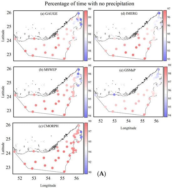 Figure 6 presents a comparative analysis of precipitation characteristics across gauge observations and four satellite-based precipitation products. Figure 6A shows the percentage of time without precipitation for each dataset, providing insight into the dry periods across the study region. The gauge observations indicate high dry spell frequencies, with most stations showing non-precipitation percentages exceeding 95%. The satellite products generally capture this dry period pattern, but notable differences emerge. CMORPH appears to underestimate dry conditions relative to gauge data, particularly in the southern regions, suggesting potential false precipitation detection. In contrast, MSWEP, IMERG, and GSMaP align more closely with the gauge estimates, though localized discrepancies are evident in coastal and northern areas.