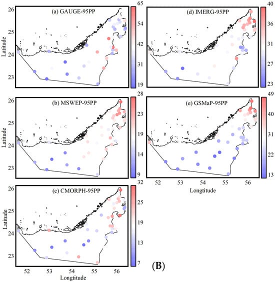 Spatial comparison of precipitation characteristics between gauge observations and four satellite-based products (MSWEP, CMORPH, IMERG, and GSMaP). (A) Percentage of time with no precipitation, illustrating the frequency of dry periods across the study region. (B) 95th percentile precipitation (95PP), representing the threshold for extreme rainfall events at each station. Color scales indicate variations in precipitation characteristics, with red representing higher values and blue representing lower values.