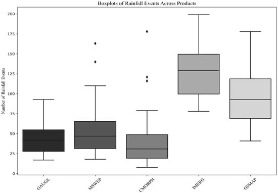Boxplots illustrating the distribution of rainfall event counts across GAUGE, MSWEP, CMORPH, IMERG, and GSMaP datasets. The interquartile range (IQR) is represented by the shaded boxes, with the median shown as a horizontal line within each box. Whiskers indicate the minimum and maximum values within 1.5 times the IQR, while outliers are marked as individual points.
