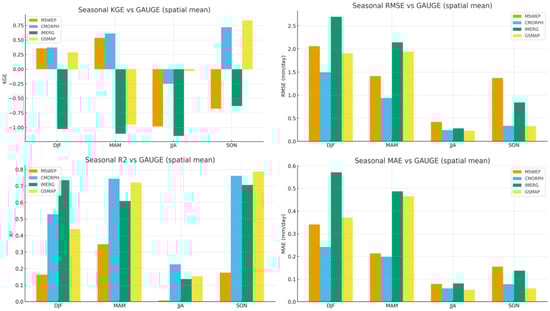 Seasonal skill metrics (R2, RMSE, MAE, and KGE) of four satellite precipitation products (MSWEP, CMORPH, IMERG, and GSMaP) compared with spatially averaged gauge observations over the UAE for the period 2004–2020.