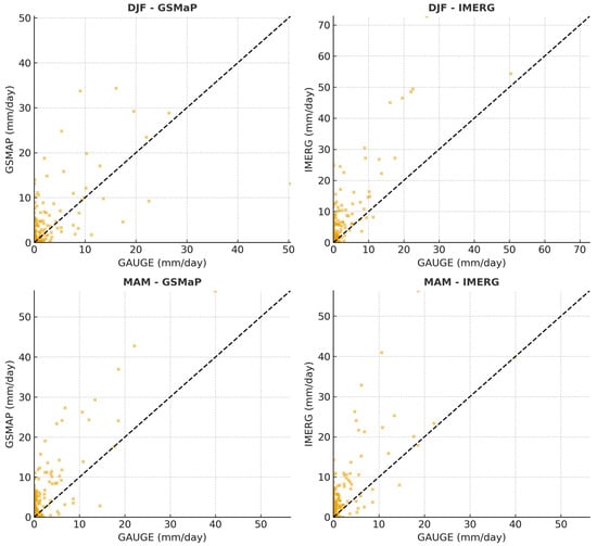Similarly, Figure 11 compares GSMaP and IMERG scatter relationships with gauge observations for DJF and MAM. Both datasets show noticeable scatter around the 1:1 reference line, with IMERG generally producing higher rainfall estimates than GSMaP.