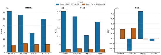 Comparison of precipitation products for distinct meteorological events. (a) RMSE; (b) MAE; and (c) KGE.