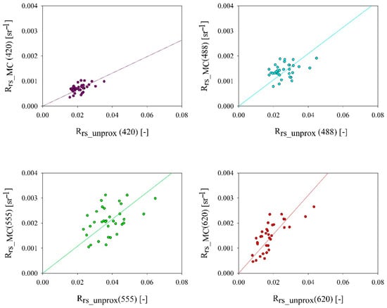 The scatter of points on all graphs took a similar form and the dependence had a linear course; there were differences only in the slope. The values of the remote sensing reflectance obtained from MC simulations changed within the range of one order of magnitude only for 620 nm. For the rest of the wavelengths, they lay within the same order of magnitude. However, the values of the bb/a + bb ratio changed within one order of magnitude for almost all wavelengths, i.e., for 420 nm, 488 nm, and 620 nm. Only for the 555 nm wavelength did they lie within the same order of magnitude. Moreover, the slope of the line approximation by Equations (7)–(10) increased with the increase in wavelength.