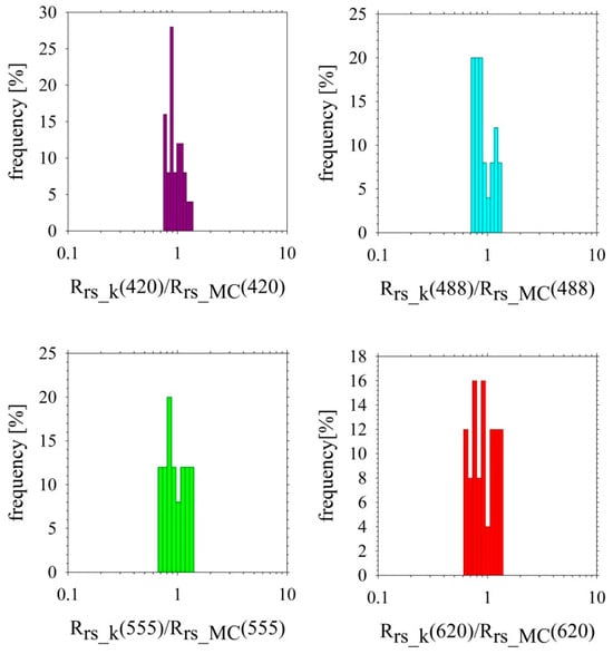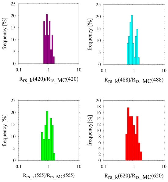 The analyses carried out to determine the parameter k values allowed us to determine values of Rrs(λ) based on the a and bb (according to Equations (7)–(10)). Graphical comparison of the Rrs values obtained from MC simulations with their respective values estimated using the k proxy parameter obtained by Equations (7)–(10) for four wavelengths and ratio distribution histograms (Rrs_k(λ)/Rrs_MC(λ)) are presented in Figure 5, Figure 6 and Figure 7. Statistical errors (according to linear and logarithmic statistics) of these estimates were also determined (Table 1 and Table 2).