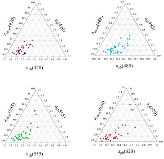 Moreover, Figure 8 shows the ternary diagrams illustrating the relative contribution of three key optical components: phytoplankton pigments, non-algal particles, and CDOM to the total absorption by non-water constituents at four wavelengths (420 nm, 488 nm, 555 nm, and 620 nm) measured in the surface waters of the Gulf of Gdańsk for 34 samples. These water samples were collected simultaneously and at the same locations as the measurements of apg, bp, and bbp. The absorption coefficients of CDOM (acdom(λ)) were obtained using spectrophotometric analysis followed by two-step filtration [57]. The absorption coefficients of phytoplankton (aph(λ)) and the absorption coefficients of non-phytoplankton pigments (ad(λ)) were measured using spectrophotometric tests with the Whatman GF/F filter pad technique [58] and depigmentation with sodium hypochloride [2]. Diagrams in Figure 8 provide insight into the dominant light-absorbing substances in the Gulf of Gdańsk.