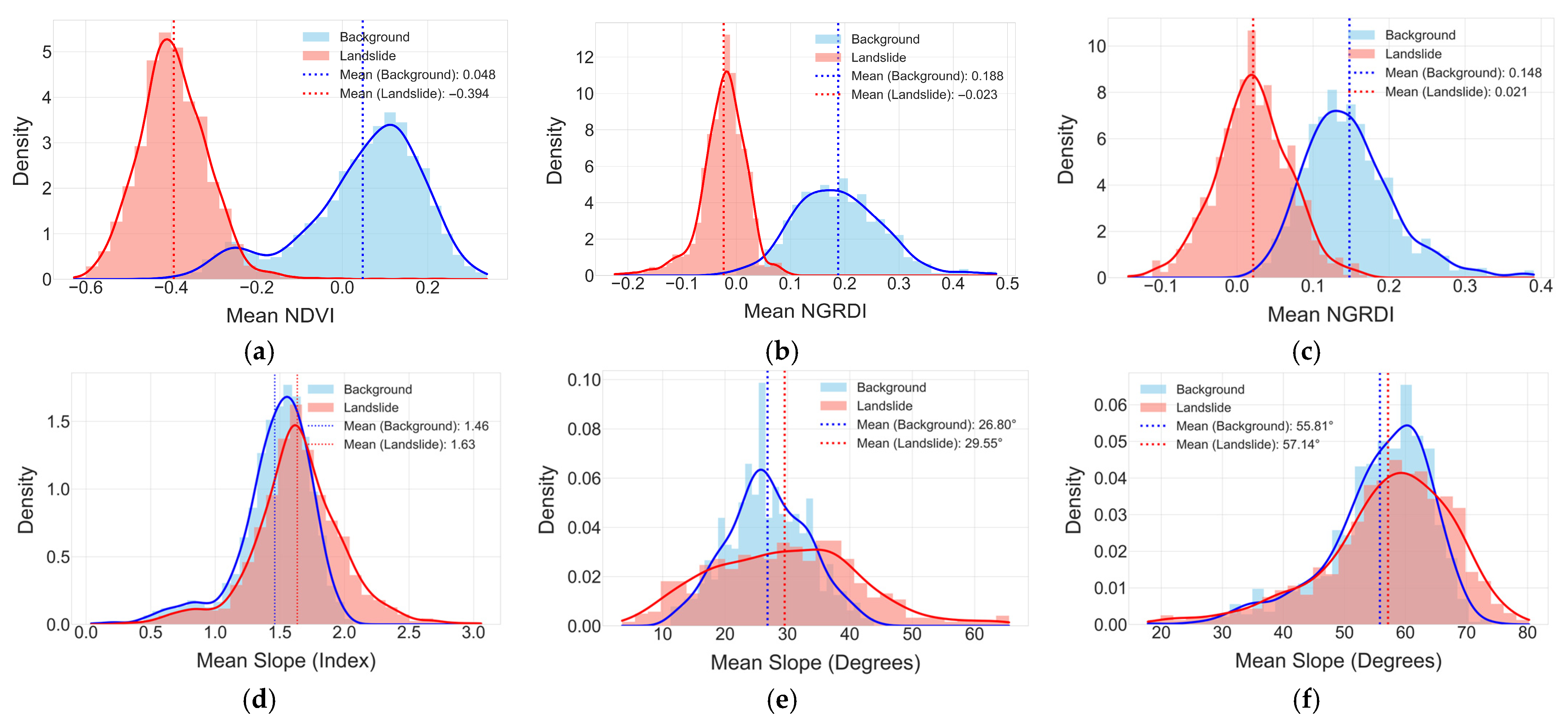 Table 7) indicate that NDVI achieved superior performance across the board due to its sensitivity to NIR bands. Compared to NGRDI, NDVI improved the IoU and F1-score by approximately 3.2% and 2.5%, respectively. This confirms that NDVI provides clearer features indicative of vegetation disruption along landslide boundaries, thereby enhancing the model’s segmentation capability.