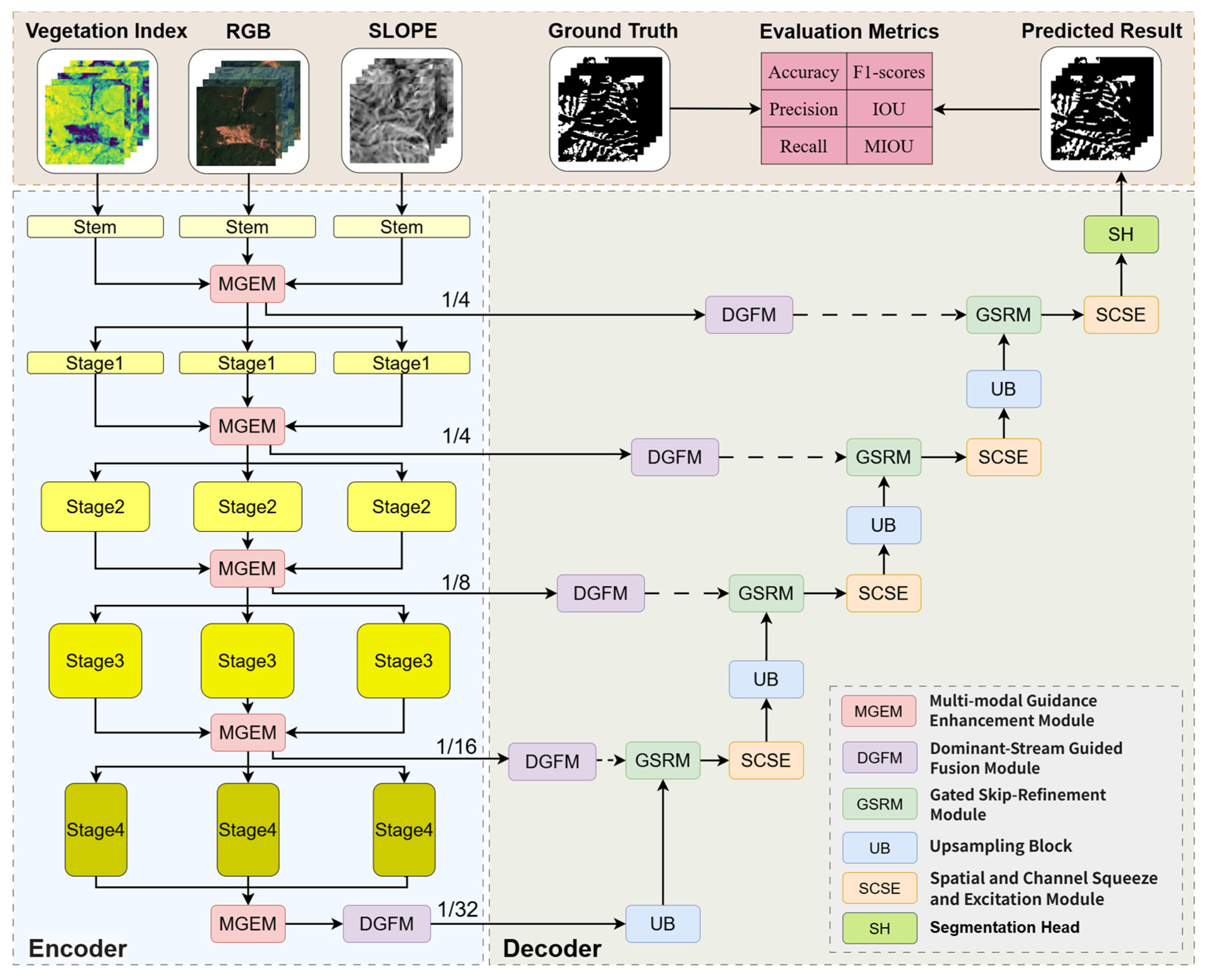 45] as its backbone. A key principle of the architecture lies in the multi-branch feature decoupling design of the encoder. We configure three parallel encoders with non-shared parameters for RGB imagery, VI, and Slope, respectively. This configuration allows the network to learn the modality-specific semantic distributions inherent to each data source. To achieve the efficient integration of heterogeneous features, TriGEFNet incorporates three key components: MGEM, DGFM, and GSRM. These modules are designed to facilitate the efficient interaction and fusion of multimodal features, thereby enhancing the final segmentation performance. This section provides a detailed analysis of the core modules constituting the network, followed by an introduction to the loss function and performance evaluation metrics utilized for model optimization.