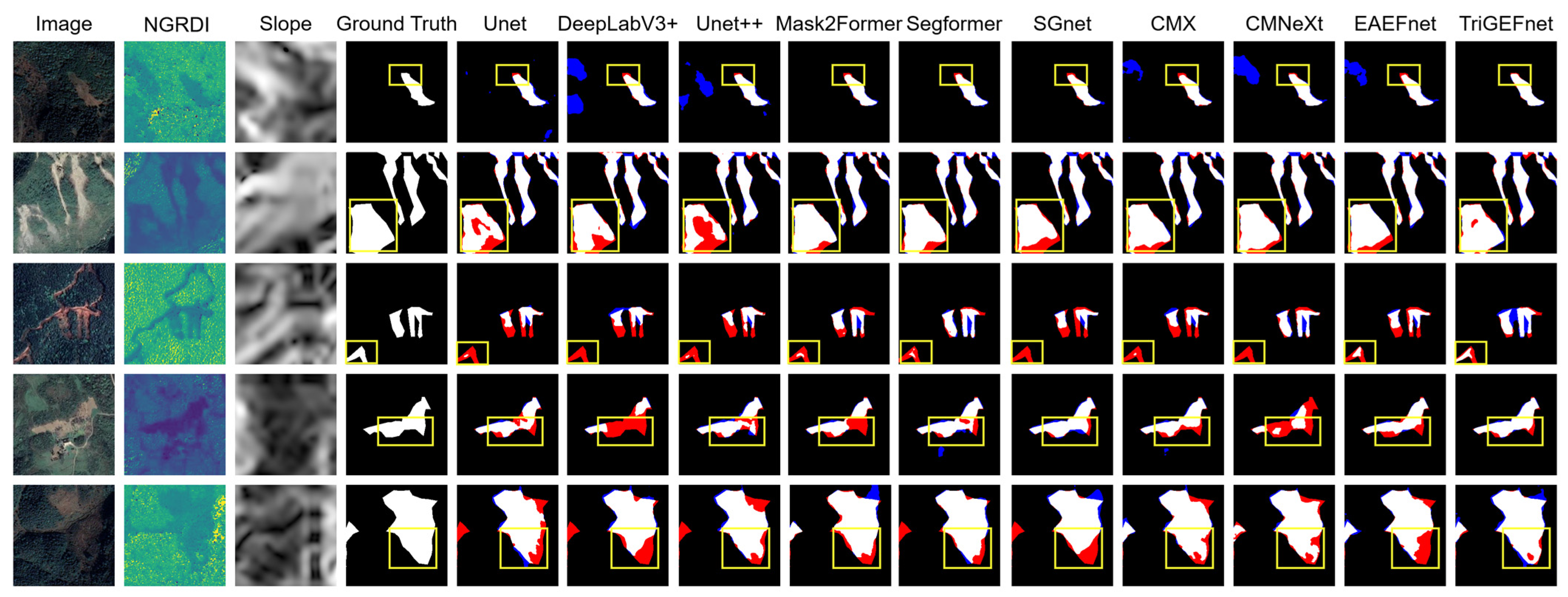In conclusion, TriGEFNet provides not only a novel and efficient paradigm for the semantic segmentation of multimodal remote sensing imagery but also robust technical support for constructing large-scale and physics-aware automated landslide monitoring systems in practical scenarios.