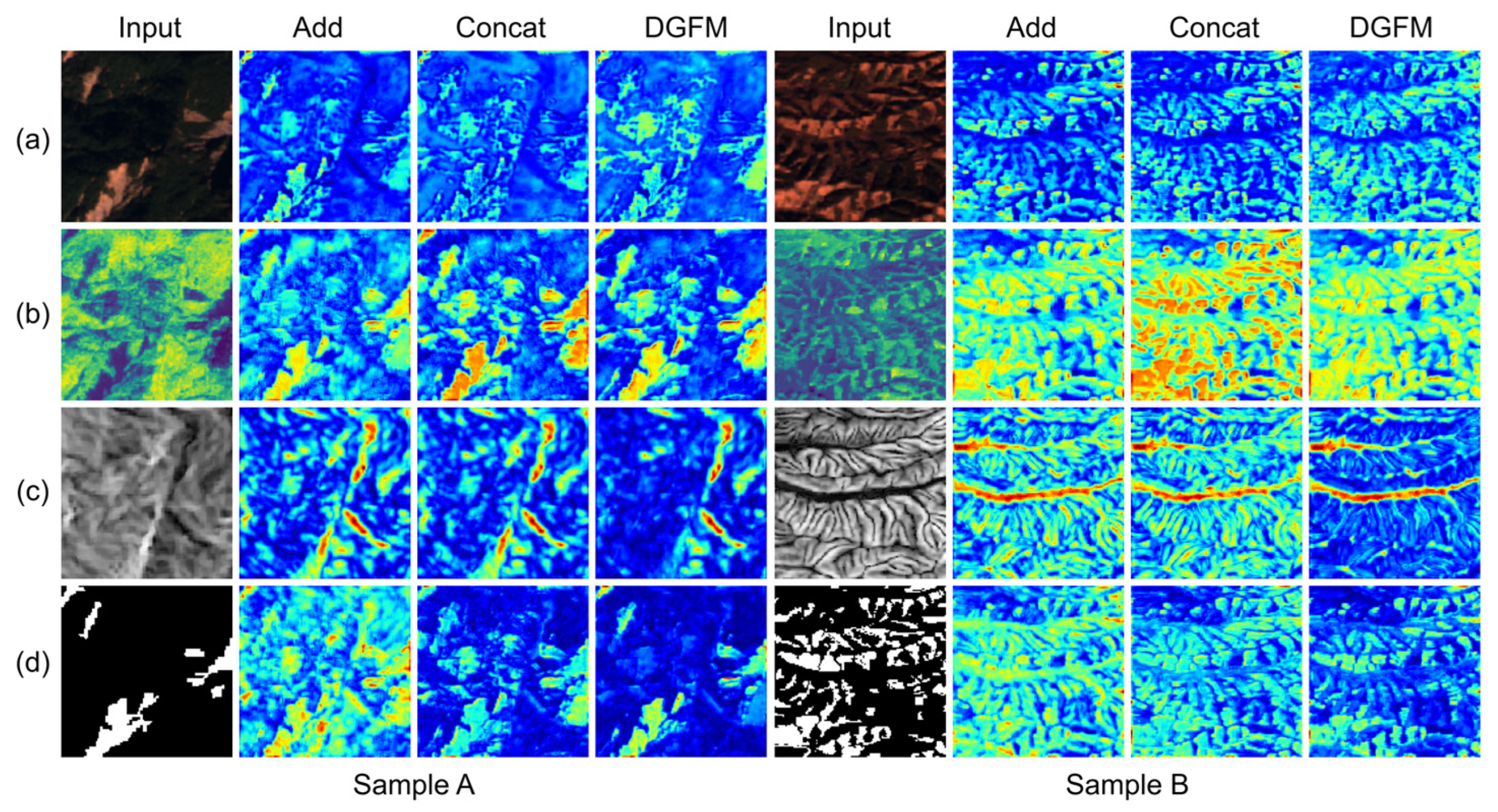 In contrast, the feature maps generated by the proposed DGFM exhibit activation regions that are highly focused on the landslide areas indicated by the Ground Truth. Simultaneously, the module effectively suppresses background noise, achieving precise feature representation. These experimental results demonstrate that the guided fusion mechanism of the DGFM effectively resolves the issue of multimodal information conflict. By establishing the RGB stream as the dominant modality and utilizing it to dynamically screen auxiliary modal information, this module successfully avoids the noise interference often introduced by simplistic fusion strategies. This prioritized design ensures the efficiency and robustness of the fusion process. Consequently, the generated features are not only enriched in semantic information but also possess significantly enhanced discriminability.