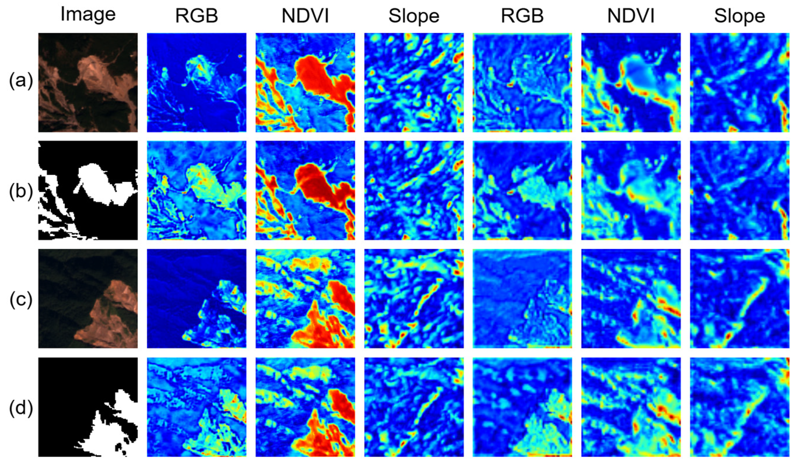Figure 12. The visualization reveals a pattern of efficient feature synergy and functional specialization. The feature maps of the NDVI exhibited strong activation responses to bare landslide surfaces. Serving as a spatial attention signal, this response significantly enhanced the feature intensity of the corresponding regions in the RGB feature maps via the MGEM. This process assigned higher feature weights to landslide areas that were originally ambiguous in the RGB features, thereby effectively boosting feature discriminability. In contrast, the enhancement applied to the Slope features was more moderate, ensuring that critical topographic patterns were preserved without being overwhelmed by strong signals from other modalities.