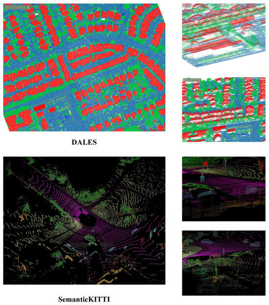 Comparison of datasets captured from different perspectives. For better visualization, different colors denote distinct semantic categories. Point clouds from the airborne dataset DALES exhibit uniform density and typically preserve upper-layer geometry and overall infrastructure (top). In contrast, point clouds from the autonomous driving dataset SemanticKITTI decrease in density with distance and tend to emphasize side-view structures while underrepresenting upper-layer geometry (bottom).