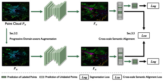 To address this issue, we propose a cross-platform, weakly supervised 3D point cloud semantic segmentation framework based on DG. From a data-centric perspective, to reduce the model’s dependency on target-domain data, we employ progressive domain-aware augmentation (PDA), which applies stochastic transformations to source-domain point clouds based on a basic augmentation strategy. This encourages the model to learn more generalizable representations across varying samples without relying on domain-specific details, thereby enhancing generalization in the absence of target-domain data. Furthermore, we design platform-specific augmentation strategies tailored to the disparities between vehicle-mounted and airborne LiDAR data, improving the model’s adaptability to different platforms. From a label-centric perspective, weakly supervised methods provide limited annotations. To further enhance semantic refinement, our framework leverages a large number of unlabeled points without disturbing the learning of labeled point features. Specifically, we introduce cross-scale semantic alignment (CSA) to enforce semantic consistency between original and augmented samples across multiple feature scales.