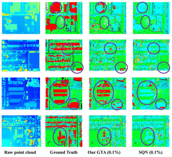 Visualization results of cross-DG from SemanticKITTI to DALES. From left to right, we show the raw point cloud, the ground-truth annotations, the predictions of our method, and those of the comparison method. Regions where our approach outperforms SQN are highlighted with purple circles. Note that the ground truth (GT) is provided as a reference to highlight the significant structural improvements of GTA compared to the baseline (SQN), particularly in recovering geometric details.