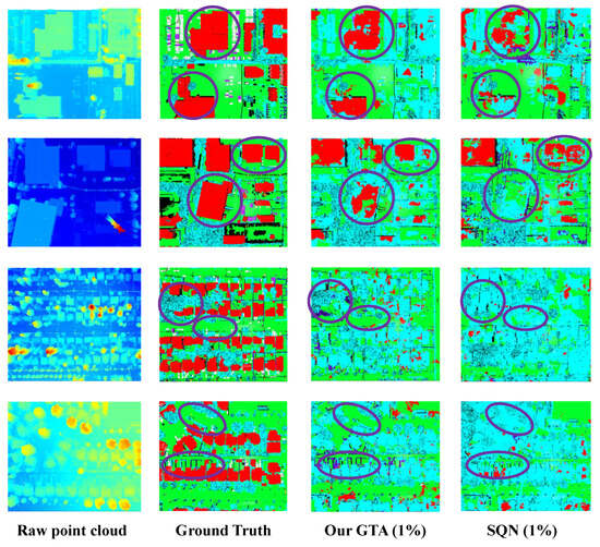 The qualitative results of transferring from SemanticKITTI to DALES using only 0.1% annotations are illustrated in Figure 3. The first column shows the raw input point clouds, which are visualized using a Scalar Field Visualization technique since the DALES dataset does not provide RGB information. The second column presents the ground-truth labels, while the third column displays the predictions generated by our method. The last column shows the predictions of SQN [73], which serves as the backbone network of our framework. Regions where our method achieves superior predictions are highlighted in purple. As can be observed, our method yields substantial improvements over SQN on the DALES dataset, particularly in the more accurate identification of buildings and cars, thereby demonstrating the effectiveness of the proposed approach.