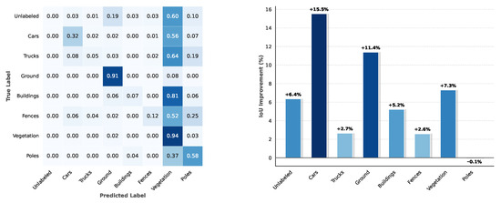 To quantitatively evaluate and analyze the performance of the model, we performed assessments on all points of the target-domain test-set DALES. We adopted the Intersection over Union (IoU) for each segmentation class and the mean Intersection over Union (mIoU) across all classes as evaluation metrics. Let K denote the total number of classes, TP the number of true positives, FP the number of false positives, FN the number of false negatives, and TN the number of true negatives [74]. The two evaluation metrics are computed as follows: