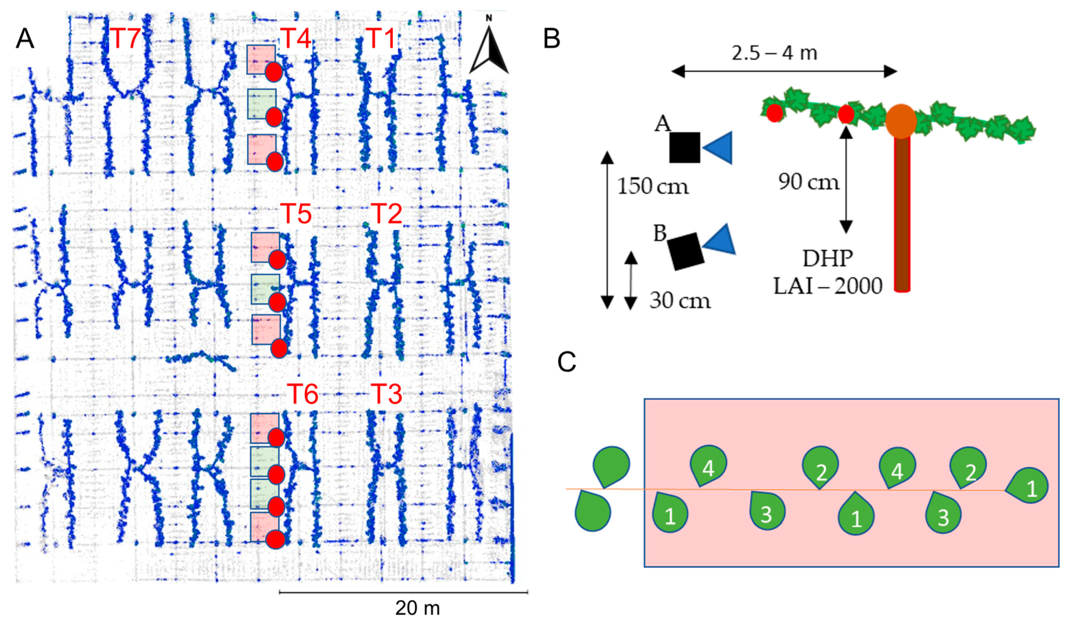 14]. In pergola-trained vineyards, the discontinuous canopy structure, row gaps, and geometric shading from trellis components can introduce systematic bias into optical LAI measurements (e.g., LAI–2200C Plant Canopy Analyzer, LI-COR, Inc., Lincoln, NE, USA). When sensors face along the row direction or when the field of view contains substantial inter-row gaps, LAI tends to be markedly underestimated [