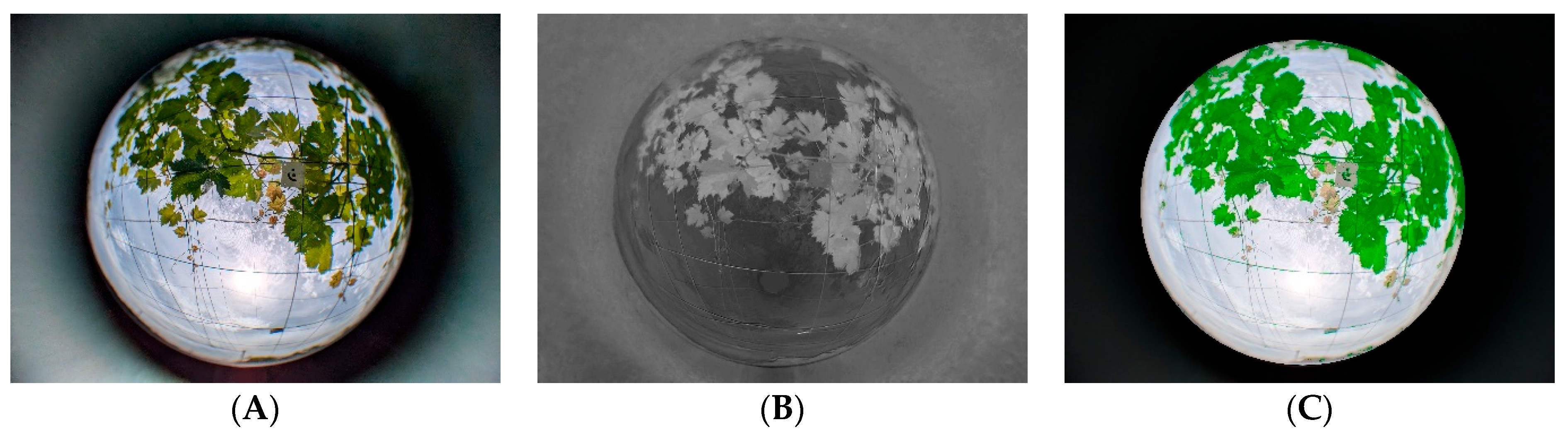 Optical LAI measurements were also conducted before and after each defoliation event. The LAI–2000 Plant Canopy Analyzer was operated according to the manufacturer’s protocol, with four measurements taken above and below the canopy, followed by averaging. Hemispherical canopy images were acquired using digital hemispherical photography (DHP), with the DHP camera positioned at the same locations as the lower LAI–2000 measurements—directly below the designated markers at a height of 90 cm—to ensure spatial consistency between optical methods. Details of DHP processing and LAI calculation are provided in a separate subsection (
