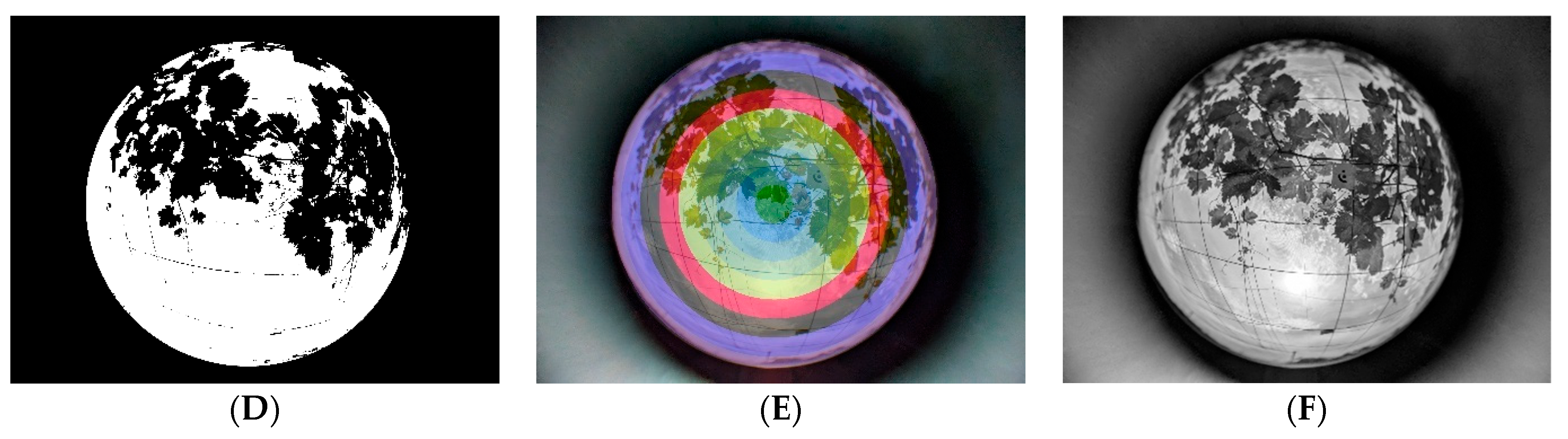 Figure 2. P5-b). Hemispherical images were acquired with a Google Pixel 7 smartphone (Google Inc., Mountain View, CA, USA) equipped with a 180° fisheye conversion lens (KRP-180fy, KenkoTokina, Tokyo, Japan) (