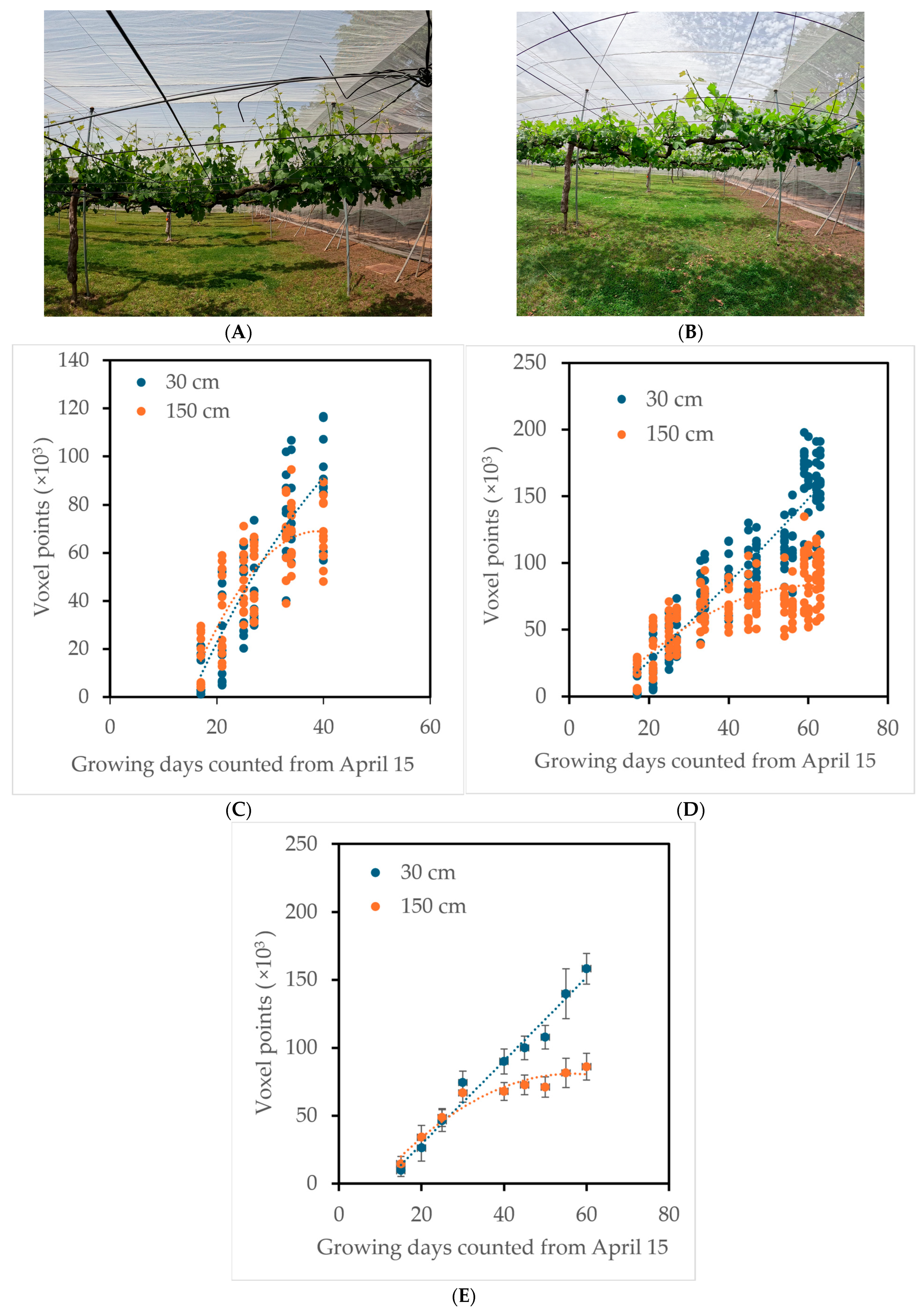37]. Thus, voxel modeling holds strong potential for leaf area estimation in pergola systems [