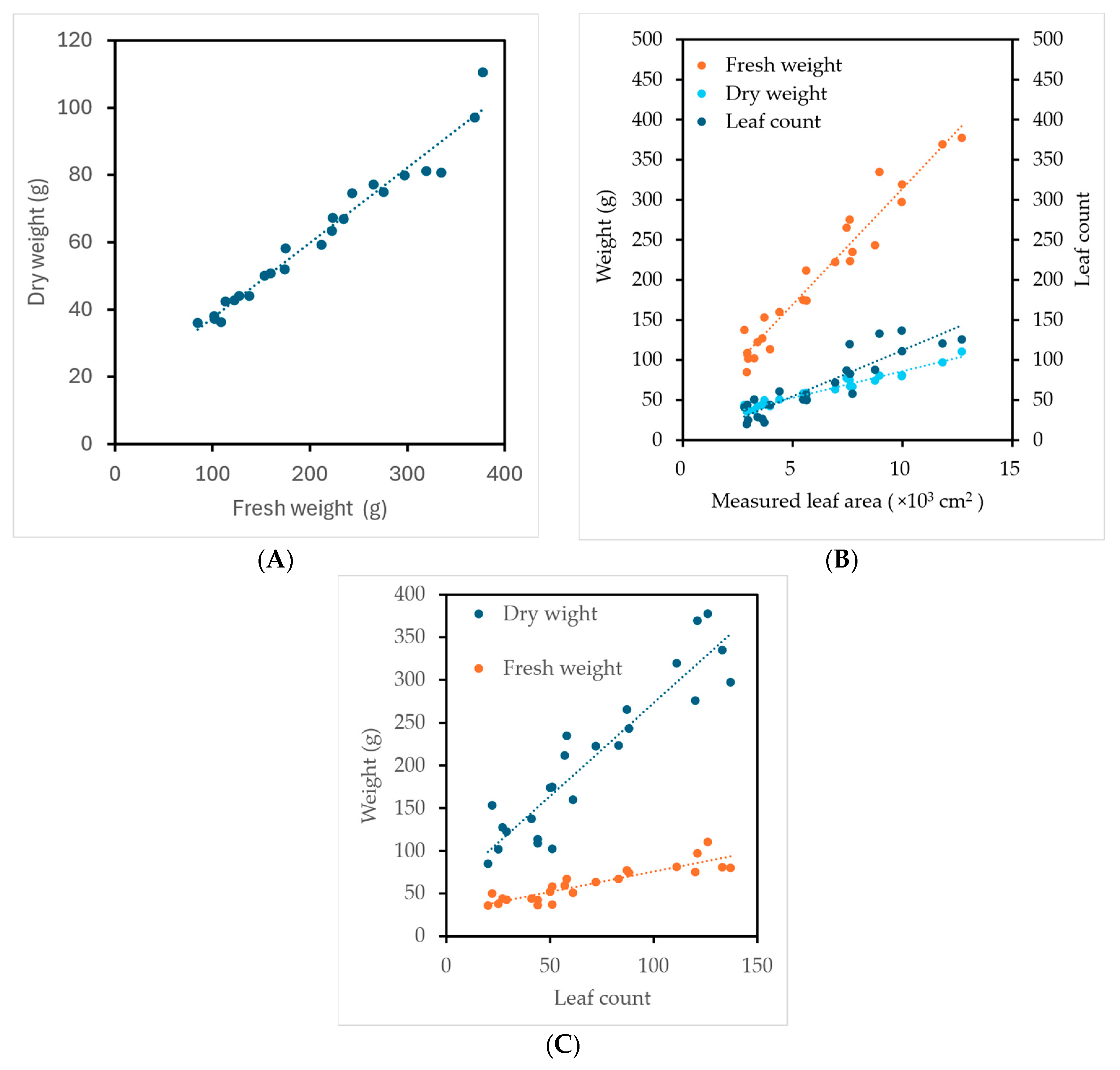 Table 6) does not indicate a physically meaningful condition at zero leaf area. Fresh and dry weights were measured using paper bags, which introduce a constant mass offset (approximately 25 ± 1 g for fresh weight and 20 ± 1 g for dry weight). In addition, leaf area estimation based on ImageJ and ExGR segmentation may systematically underestimate projected area due to incomplete leaf flattening, self-overlap, and shadowed regions during image acquisition. As the regression models were fitted within an observed range that does not include zero-leaf conditions, the intercept should therefore be interpreted as a measurement-related offset rather than a biological parameter, and regression interpretations are accordingly restricted to the observed canopy development range.