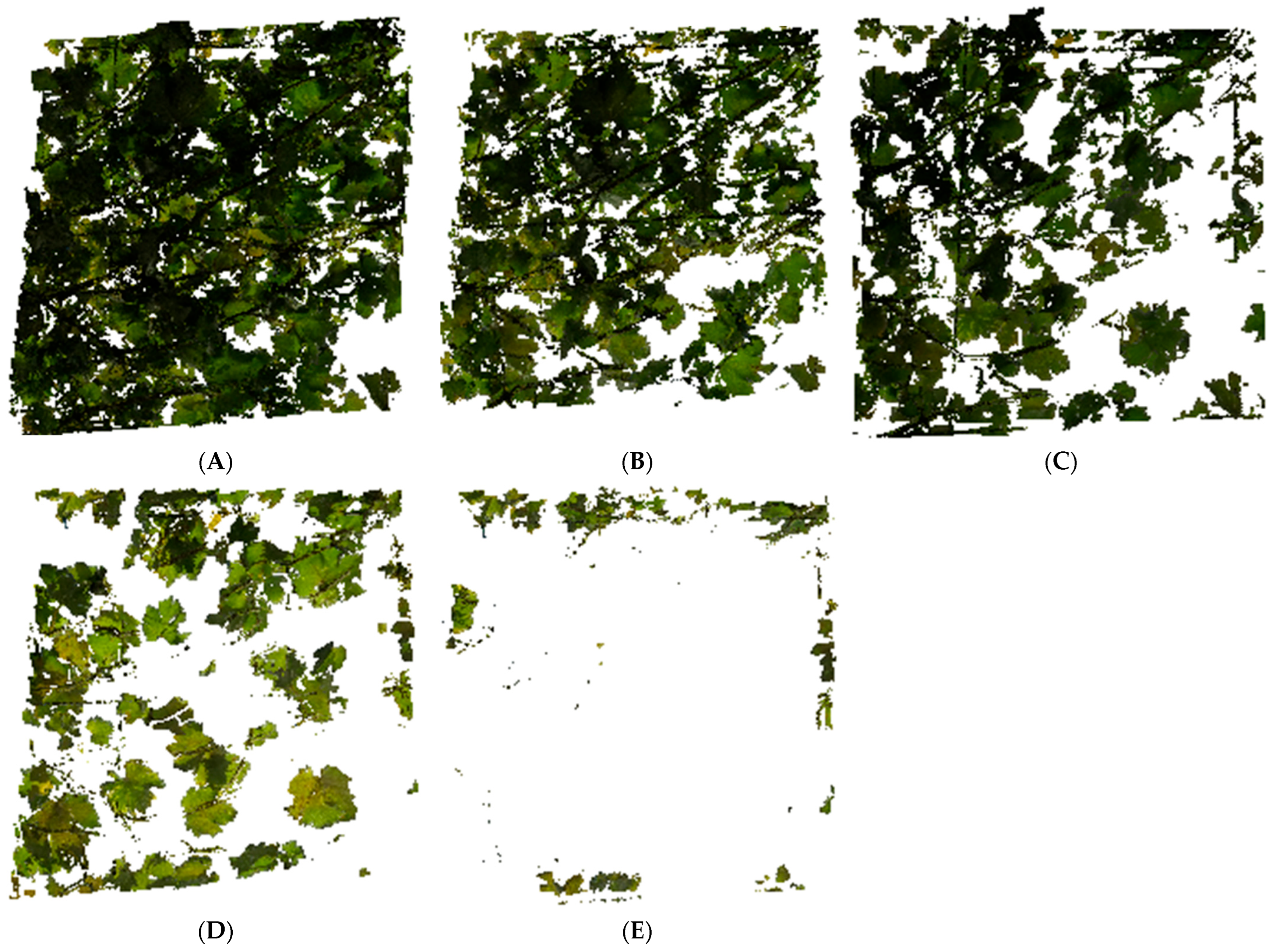 Once alignment was completed, the point clouds were classified and denoised to remove non-canopy elements. An Excess Green minus Excess Red (ExGR) index threshold of 0 was applied to distinguish foliage from woody organs and trellis structures. The thresholding effectively removed brown or whitish materials such as shoots, trellis metal components, and ground reflections, preserving the green vegetation points and enabling clear isolation of leaf points from the background.