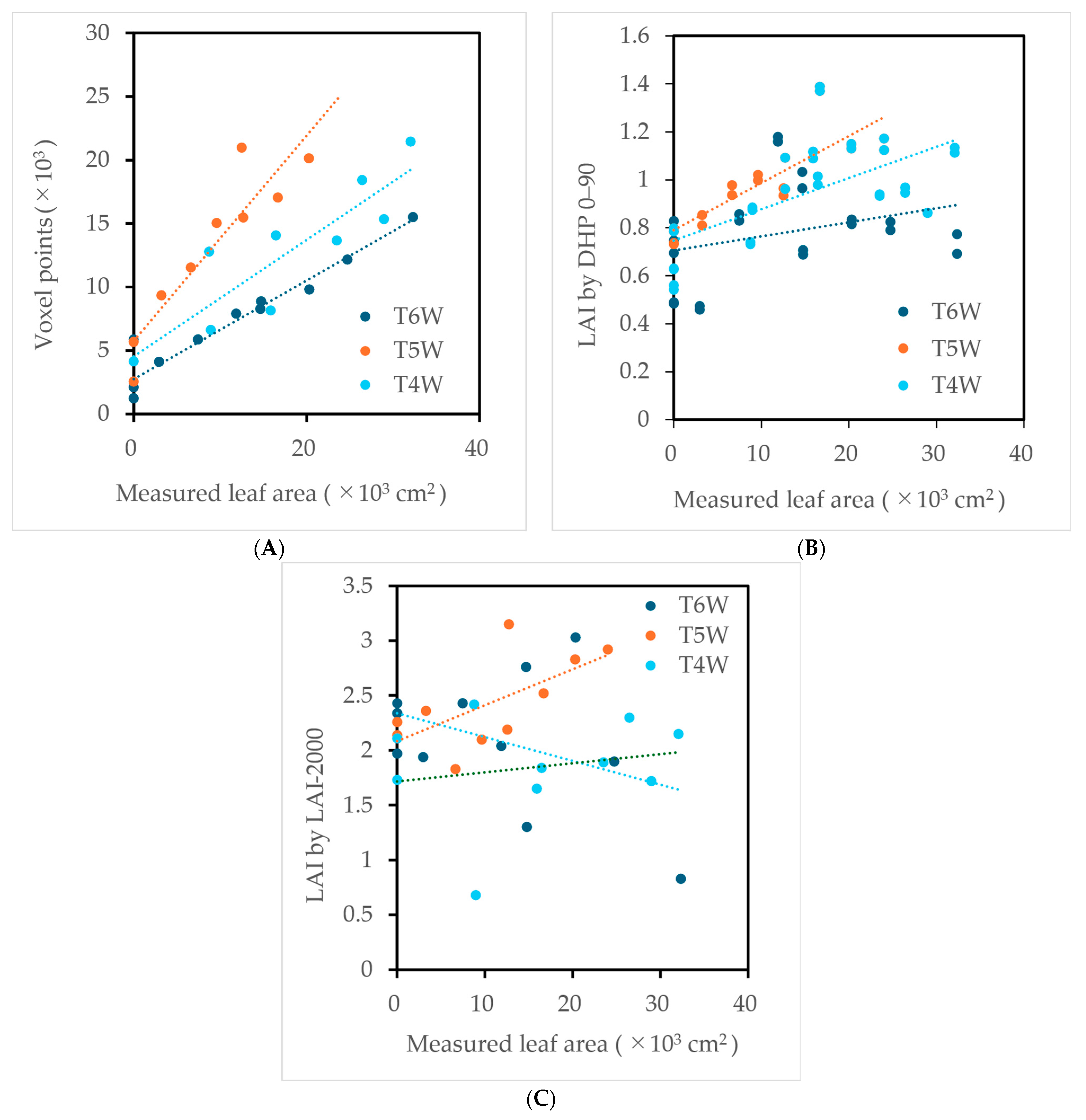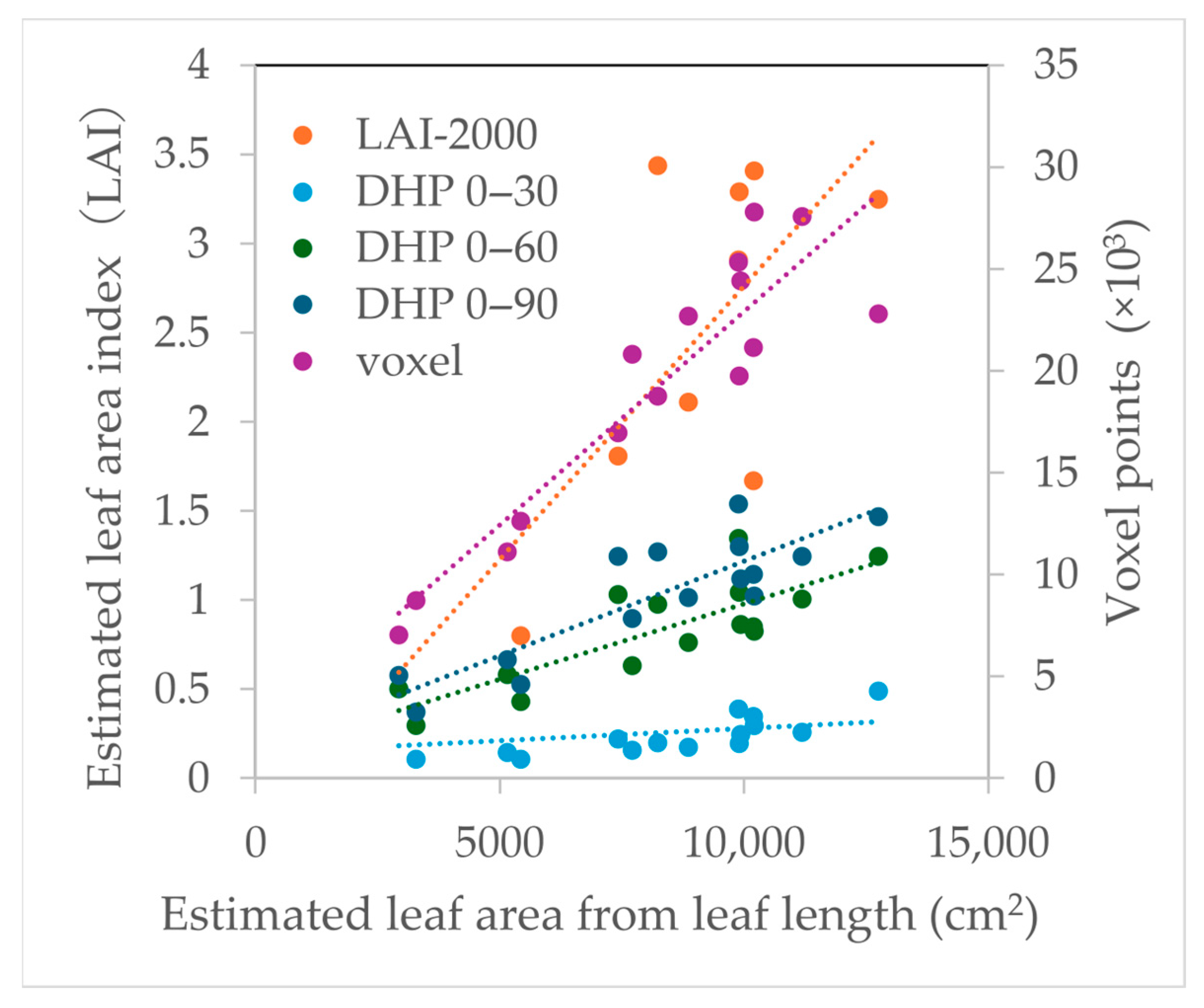 The DHP-derived LAI indices (0–30°, 0–60°, and 0–90°) were compared with voxel occupancy, LAI–2000 measurements, and destructively measured leaf area.