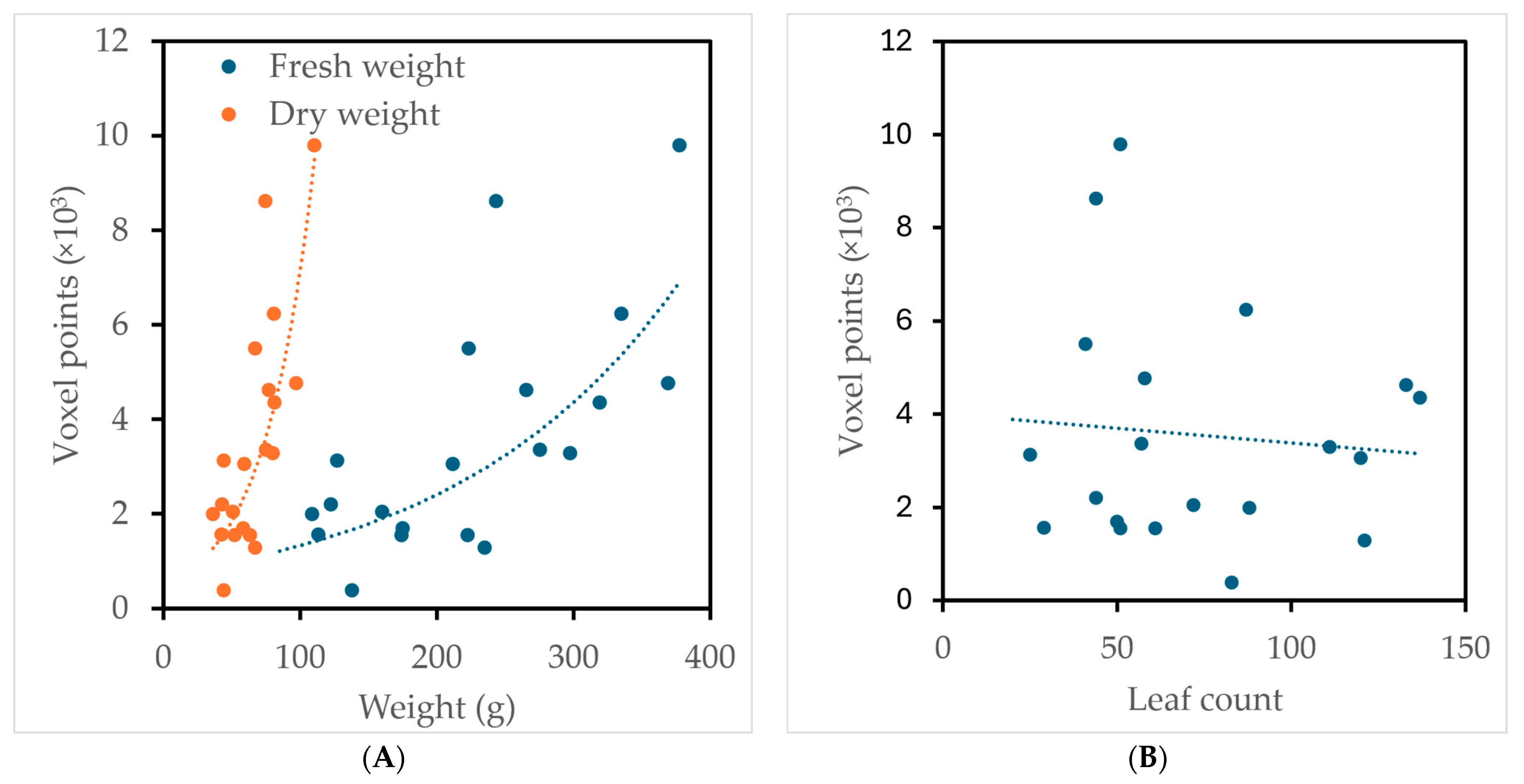 33]. The relationship between voxel count and canopy structural attributes is therefore more closely aligned with physiological leaf quantity and can capture features that optical LAI instruments and 2D geometric proxies cannot [