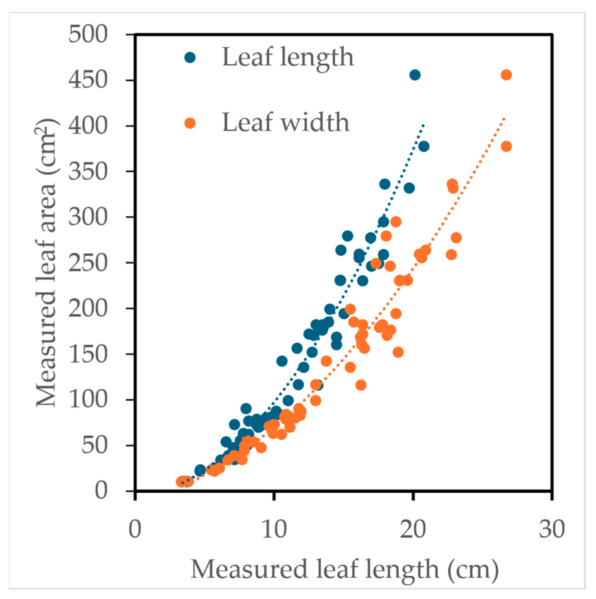 Leaf images obtained from the destructive sampling were analyzed using ImageJ to quantify leaf length, maximum leaf width, and individual leaf area. These measurements were used to develop regression-based leaf area estimation models (