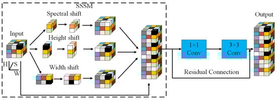 Detailed structure of the Spectral–Spatial Shift Module. The module performs cyclic shifts along spectral (S), height (H), and width (W) dimensions, followed by concatenation and convolutional fusion. The residual connection preserves gradient flow and stabilizes training. Shift operations enable efficient cross-dimensional interaction without introducing additional parameters.