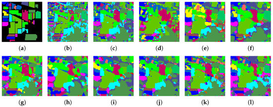 Classification maps of different models on the Indian Pines dataset with 1% samples per class as the training set. (a) Ground truth; (b) CNN-2D; (c) SSRN; (d) HybridSN; (e) SSFTT; (f) MorphFormer; (g) MambaHSI; (h) MFormer; (i) GCN; (j) CEGCN; (k) Graph-Mamba; (l) SSGTN (ours).