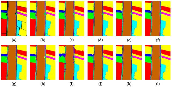 Classification maps of different models on the WHU-Hi-LongKou dataset with 1% samples per class as the training set. (a) Ground truth; (b) CNN-2D; (c) SSRN; (d) HybridSN; (e) SSFTT; (f) MorphFormer; (g) MambaHSI; (h) MFormer; (i) GCN; (j) CEGCN; (k) Graph-Mamba; (l) SSGTN (ours).
