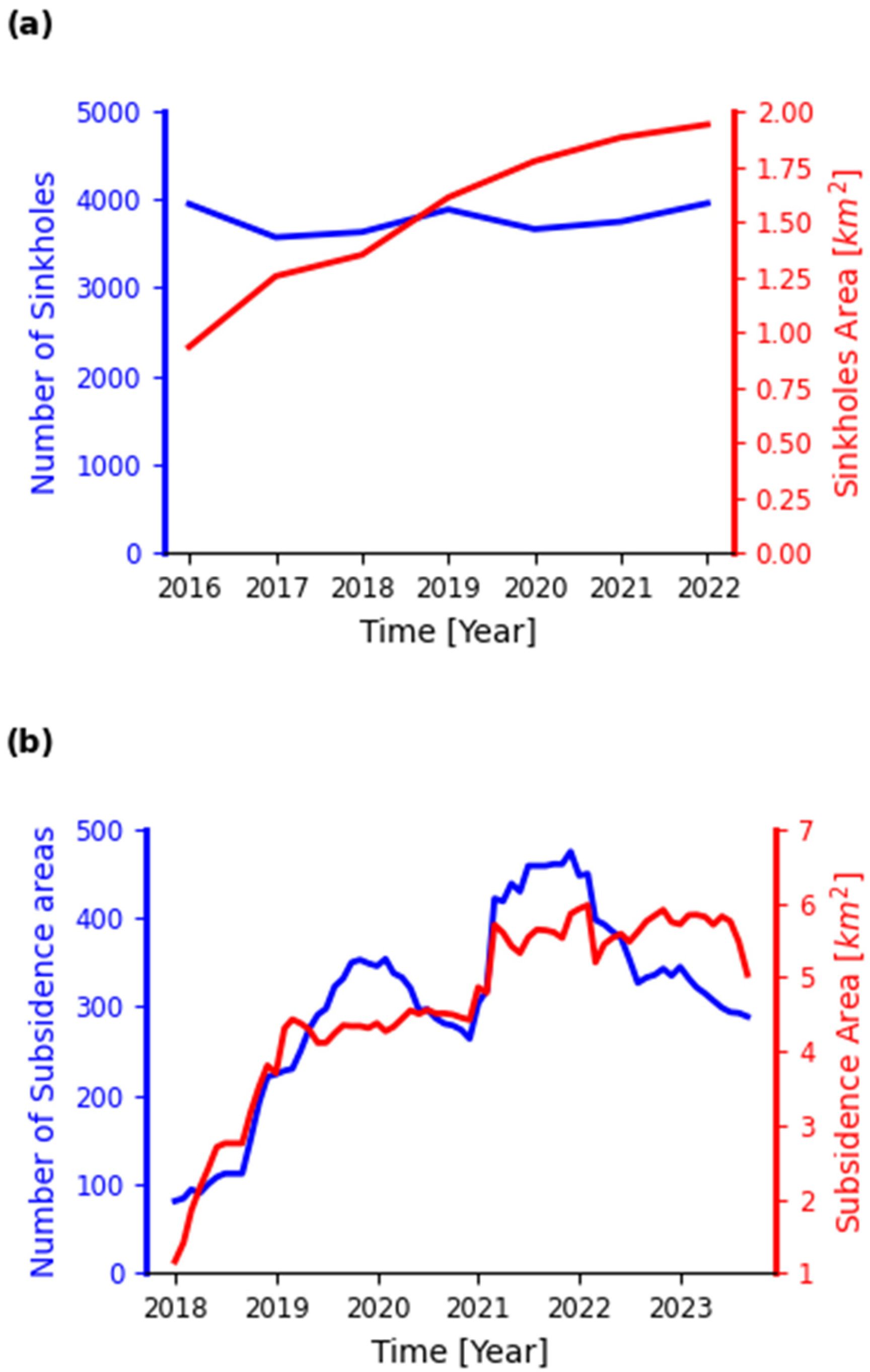 - Orhan, O.; Haghshenas Haghighi, M.; Demir, V.; Gökkaya, E.; Gutiérrez, F.; Al-Halbouni, D. Spatial and Temporal Patterns of Land Subsidence and Sinkhole Occurrence in the Konya Endorheic Basin, Turkey. Geosciences 2023, 14, 5. [Google Scholar] [CrossRef]