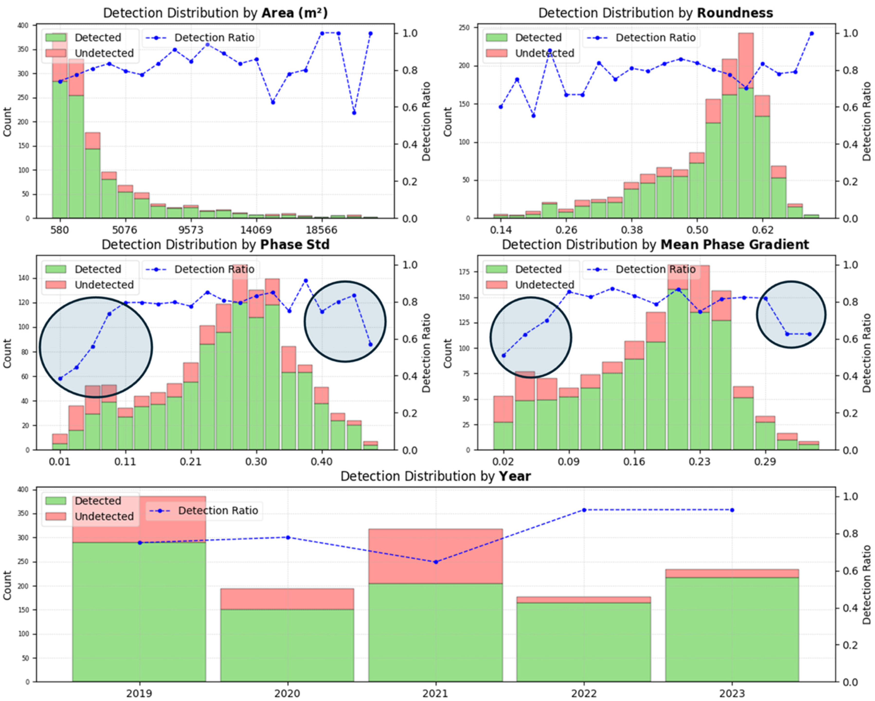 - Different train–test partitioning schemes reveal a clear hierarchy of model generalization, quantified using object-level performance metrics, from recognizing partially seen subsidence patterns to transferring across unseen acquisitions and geospatial regions.
