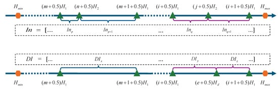 Next, Figure 5 is used as an example to introduce the process. The cluster distribution of the original phase group [, ] is shown at the top of Figure 5. The cluster distribution of the differential phase group [, ] is shown at the bottom of Figure 5. As shown in Figure 5: = […, , , …, , , …] is the theoretical original intercept vector of the original phase group, and = […, , …, , , …] is the theoretical differential intercept vector of [, ] derived from (13). The intersection of endpoints [, …, , , …, , , …, ] with the height line can yield multiple non-overlapping line segments, which are defined as height spaces. The theoretical original intercept vector and the theoretical differential intercept vector corresponding to an height space are defined as and , respectively. For example, , in Figure 5 corresponds to = [, ], = [].