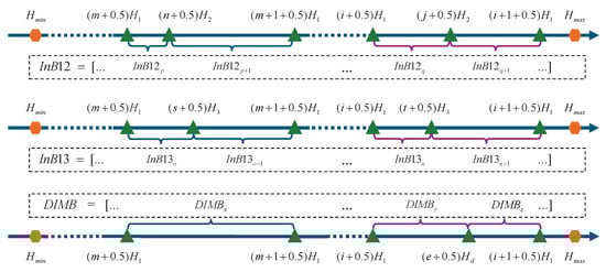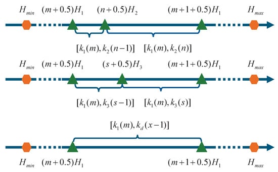 First, the relationship between the distribution of cluster groups and the height of the observation area is presented. As shown in Figure 3, the arrowed line at the top of the Figure 3 represents the height line, where and are the minimum and maximum heights of observation area, respectively. , , and are half-integer multiples of the ambiguity height . Points () are endpoints on the height line that intersect the height line to form multiple non-overlapping line segments. In the following, the non-overlapping line segment in the lower part of Figure 3 is used as an example for explanation. Under error-free conditions, all pixels within the non-overlapping line segment have the same ambiguity number vector . According to (5), if the ambiguity number vector is identical, intercepts of pixels within will be the same. This means that these pixels form a cluster group. This gives the theoretical relationship: the number of non-overlapping line segments on the height line , the number of cluster groups , and the number of theoretical intercepts M are identical:
