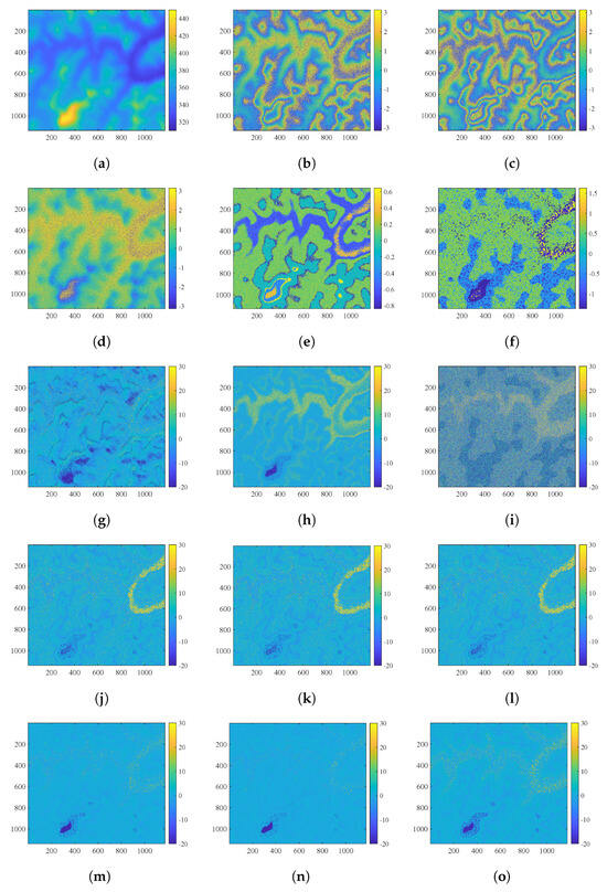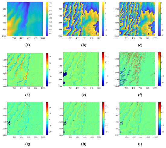 Figure 9b shows the noisy interferometric phase of , and Figure 9c shows the noisy interferometric phase of . Both Figure 9b,c are subjected to Gaussian white noise with a standard deviation of 1 rad. Figure 9d–m are the results under this noise condition Figure 9d shows the differential interferometric phase formed by combining Figure 9b,c. Figure 9e shows the filtered intercepts of the original phase group. Figure 9f shows the filtered intercepts of the differential phase group.