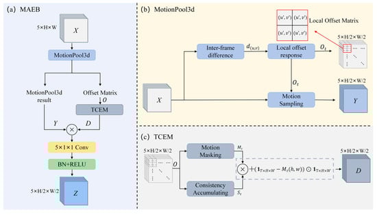 Framework of MAEB. (a) Overall architecture of MAEB. (b) Structure of MotionPool3d within MAEB. (c) Structure of TCEM within MAEB.