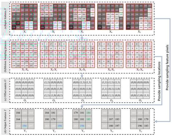 Within each 2 × 2 local window, the differencing values are denoted as , where u and v represent the row and column coordinates inside the window, respectively, as illustrated in Figure 4c. When a target pixel exhibits displacement along either the row or column direction between consecutive frames, it is marked as a displacement response with a value of 1; otherwise, no response is recorded, and the value is set to 0. To emphasize motion saliency, a motion sampling strategy is adopted: