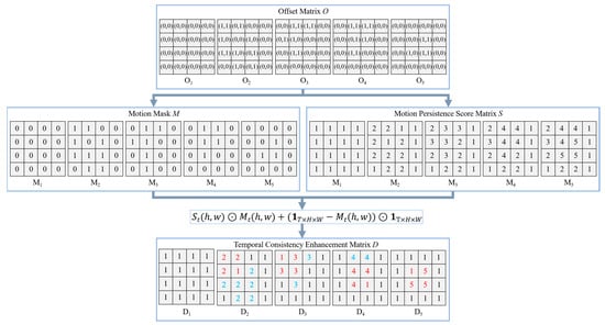 where indicates whether pixel exhibits motion in frame t. Subsequently, a recursive accumulation of continuous motion scores is performed along the temporal dimension. At the initial frame , the score matrix is initialized as an all-zero matrix. For frame the score at each position is first updated by taking the maximum value of the scores from the previous frame within its spatial neighborhood: