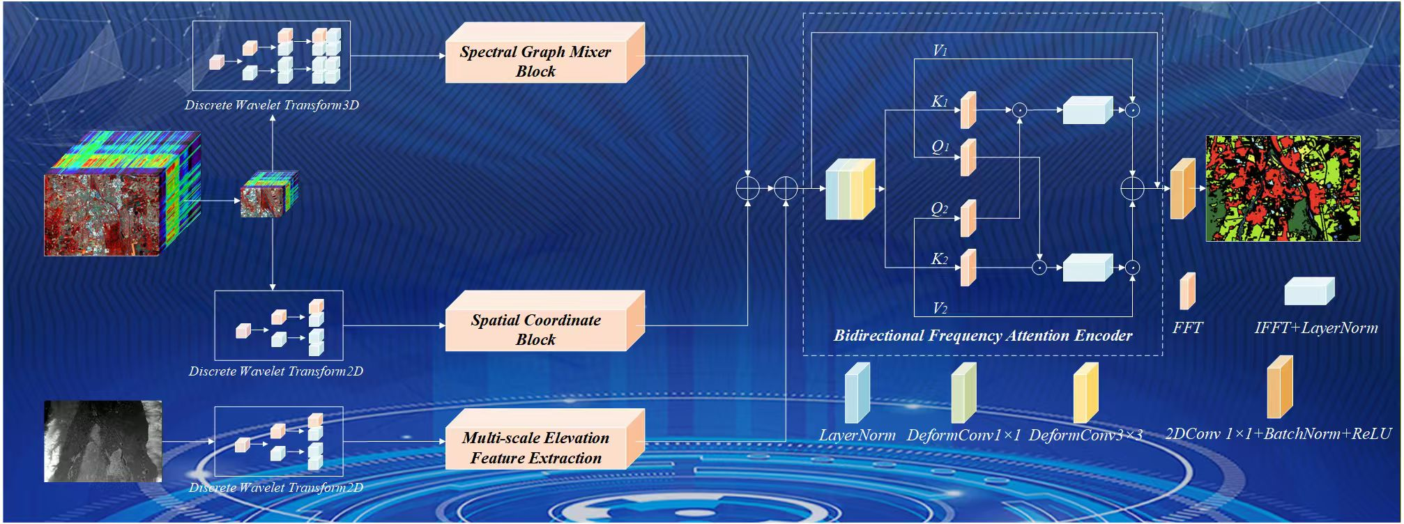 To address the challenges of feature extraction and cross-modal interaction in HSI and LiDAR data fusion, this paper proposes an integrated deep learning framework with a well-defined processing pipeline. The framework begins by employing Symlets wavelet transform for preprocessing the raw data, extracting physically meaningful hierarchical feature representations in the frequency domain. During the feature extraction stage, the designed Spectral Graph Mixer Block module (SGMB) utilizes a collaborative architecture combining multi-dimensional convolutional neural networks with an enhanced gated graph convolutional network to simultaneously extract joint spectral–spatial features from HSI while establishing long-range spatial dependencies. The Spatial Coordinate Block module (SCB) incorporates advanced positional encoding through coordinate convolution technology, explicitly embedding spatial coordinates into the feature representation to enhance the model’s awareness of object contours and distribution patterns. For LiDAR data, the Multi-scale Elevation Feature Extraction Module (MSFE) employs a multi-scale dilated convolution structure coupled with a feature enhancement module to achieve cross-scale feature capture. Finally, all features are integrated through a Bidirectional Frequency Attention Encoder (BiFAE) for cross-modal fusion; this module introduces a novel bidirectional attention mechanism that operates in the frequency domain, enabling efficient and deep interaction between multimodal features. This design allows the model to selectively enhance complementary information from hyperspectral and LiDAR data while suppressing redundant features, resulting in more discriminative fused representations. Together, these components form a complete processing chain from preprocessing to feature extraction and multimodal integration.