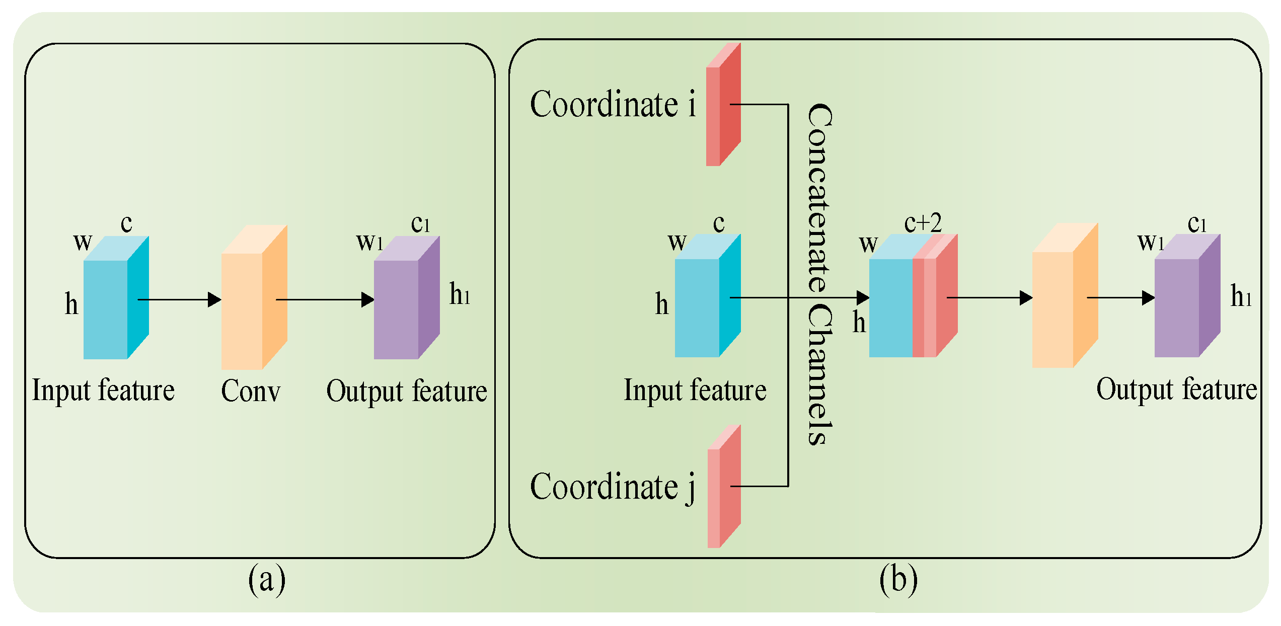 As shown in Figure 3, diagrams (a) and (b) illustrate a structural comparison between the traditional convolutional layer and the CoordConv layer, respectively. The traditional convolutional layer directly maps input features to output features, whereas the CoordConv layer additionally introduces coordinate information on top of the input data. By concatenating these coordinate maps with the original data along the channel dimension, the convolution kernel is enabled to perceive the absolute spatial position of each pixel, thereby enhancing the model’s ability to capture spatial-geometric relationships. Specifically, the preprocessed low-frequency components X H l l of HSI spatial information are first augmented through channel-wise concatenation with normalized height-axis ϕ i ( h ) and width-axis ϕ j ( w ) coordinate maps, forming enhanced features Fcoord. The Fcoord then undergoes feature transformation through successive convolutional layers. The first transformation stage applies CoordConv with kernel of size 1 × 1, 1 stride, 0 padding, followed by batch normalization and ReLU activation to extract position-sensitive features while preserving spatial resolution.