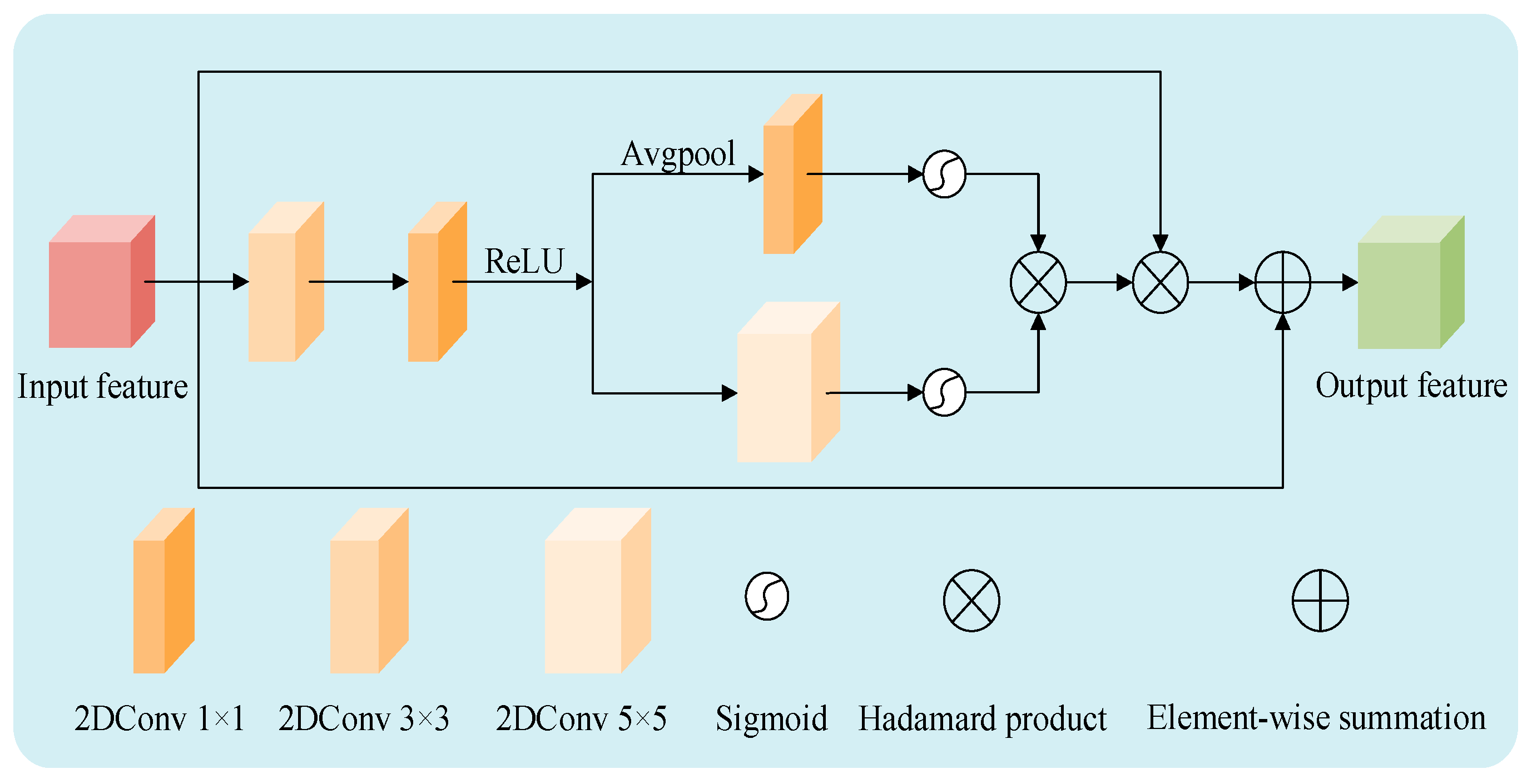 where k is the convolutional kernel size, d is the dilation rate. The effective receptive fields corresponding to each branch act on different scenes, respectively. The 3 × 3 receptive field is used to capture microscopic features such as surface texture; the equivalent 5 × 5 receptive field is used to extract medium-scale features such as building outlines; the equivalent 7 × 7 receptive field focuses on modeling large-scale spatial patterns such as terrain undulations and introduces learnable weight to achieve dynamic fusion of multi-scale features. The process is as follows,