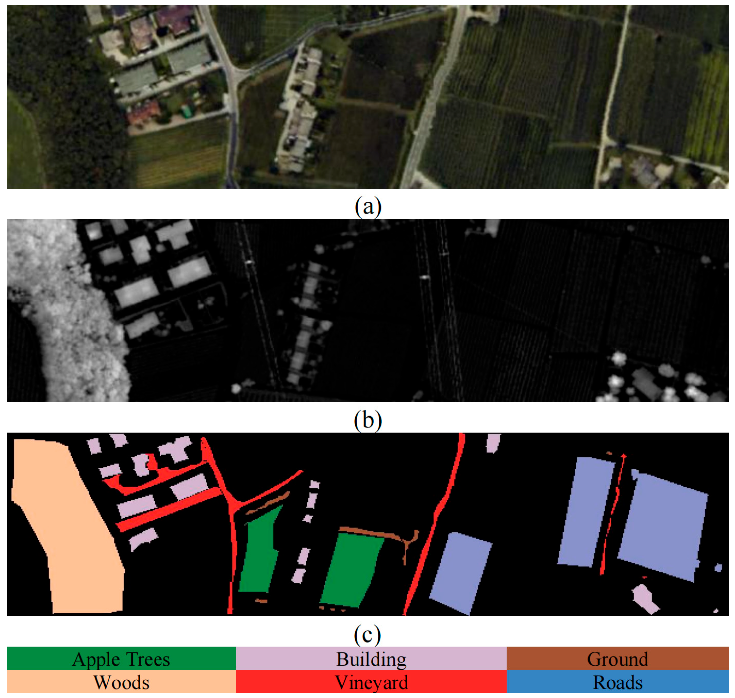 To break through this bottleneck, the researchers have begun to explore the joint analysis of HSI and LiDAR data. LiDAR data can actively obtain the elevation information of ground objects, effectively making up for the deficiency of hyperspectral images in spatial geometric features. In recent years, deep learning has developed rapidly in the field of joint classification of HSI and LiDAR data, promoting continuous innovation in multimodal fusion technology. Many networks are dedicated to extracting local spatial and spectral features. Li et al. [32] proposed CMFNet, a cross Mamba fusion network for hyperspectral and LiDAR data classification, which leverages a Mamba-based sequence modeling mechanism to facilitate efficient cross-modal feature interaction and long-range dependency modeling. He et al. [33] proposed a lightweight fusion vision Mamba network, which achieves efficient collaborative classification of hyperspectral and LiDAR data through jump sampling and dual-path fusion. Wang [34] proposed a spatial–spectral-structural feature fusion network (S3F2Net), which achieves multi-view feature collaborative classification of hyperspectral and LiDAR through a CNN-GCN hybrid architecture and dynamic node updates. Zhao et al. [35] proposed a hybrid framework combining deep CNN and hierarchical random walk to optimize the preliminary classification results of CNN by utilizing multi-scale spatial context information of HSI and LiDAR data. Pan et al. [36] proposed a multi-scale hierarchical cross-fusion network, which achieves spatial–spectral cross-fusion and classification optimization of hyperspectral and LiDAR data through multi-scale cascaded feature extraction and hierarchical fusion modules. Lu et al. [37] proposed a cross-modal fusion network guided by assimilation modal mapping, achieving an improvement in the joint classification performance of hyperspectral and lidar data. Ni et al. [38] proposed a coarse-fine high-order network, which achieved hierarchical feature enhancement and classification optimization of multi-source remote sensing data. Roy et al. [39] proposed a cross-hyperspectral and lidar attention converter, which achieves the collaborative fusion of spatial–spectral and elevation features of multi-source remote sensing data through cross-modal attention interaction and heterogeneous convolutional feature extraction. Jing et al. [40] proposed a heterogeneous contrast image fusion network, which achieves contrast alignment and adaptive fusion of HSI and LiDAR through dual-flow image attention and dynamic structure learning. The global-local Transformer network proposed by Ding [41] achieves efficient joint classification of HSI and LiDAR data by integrating the global modeling capability of Transformer and the local feature extraction advantage of CNN. Roy [42] proposed a multimodal fusion Transformer that models cross-modal global dependencies through a self-attention mechanism, significantly enhancing the joint classification performance of HSI and LiDAR data. Xue [43] proposed that the depth-level vision Transformer effectively integrates and classifies multi-level semantic information of HSI and LiDAR data through a hierarchical cross-scale attention mechanism. Qin [44] proposed a spectral–spatial graph convolutional network and constructed an end-to-end semi-supervised classification framework by concatenating CNN with GCN. Zhao [45] constructed a new hierarchical CNN and transformer network (HCT), and its cross-token attention encoder established a pixel-level spectral-elevation correlation model in the spatial dimension, significantly enhancing the long-range dependency modeling capability. Wang [46] developed a multi-scale spatial-spectral cross-attention network (MS2CANet), which extracted multi-scale detail features through pyramid convolutional grouping and introduced a feature recalibration module to enhance key information. Wei et al. [47] proposed Multimodal Data Fusion Classification via Adaptive Frequency Domain Sparse Enhancement (AFDSE), which performs multimodal data fusion classification by adaptively enhancing discriminative frequency-domain sparse representations, effectively suppressing redundant information and improving classification robustness across heterogeneous data sources. Ni [48] proposed a frequency-domain-based network framework (FDNet), which extracts multi-scale frequency features through discrete wavelet transform and captures global semantic information by combining the self-attention mechanism of fast Fourier transform.