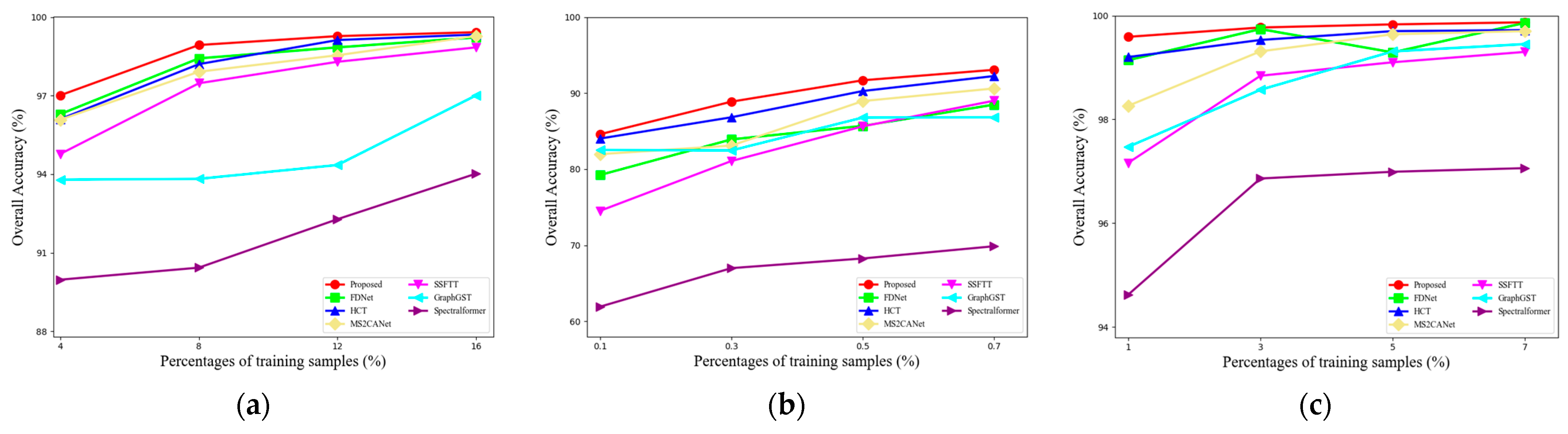 Figure 15. OA with different training samples percentages. (a) Houston2013. (b) Augsburg. (c) Trento.