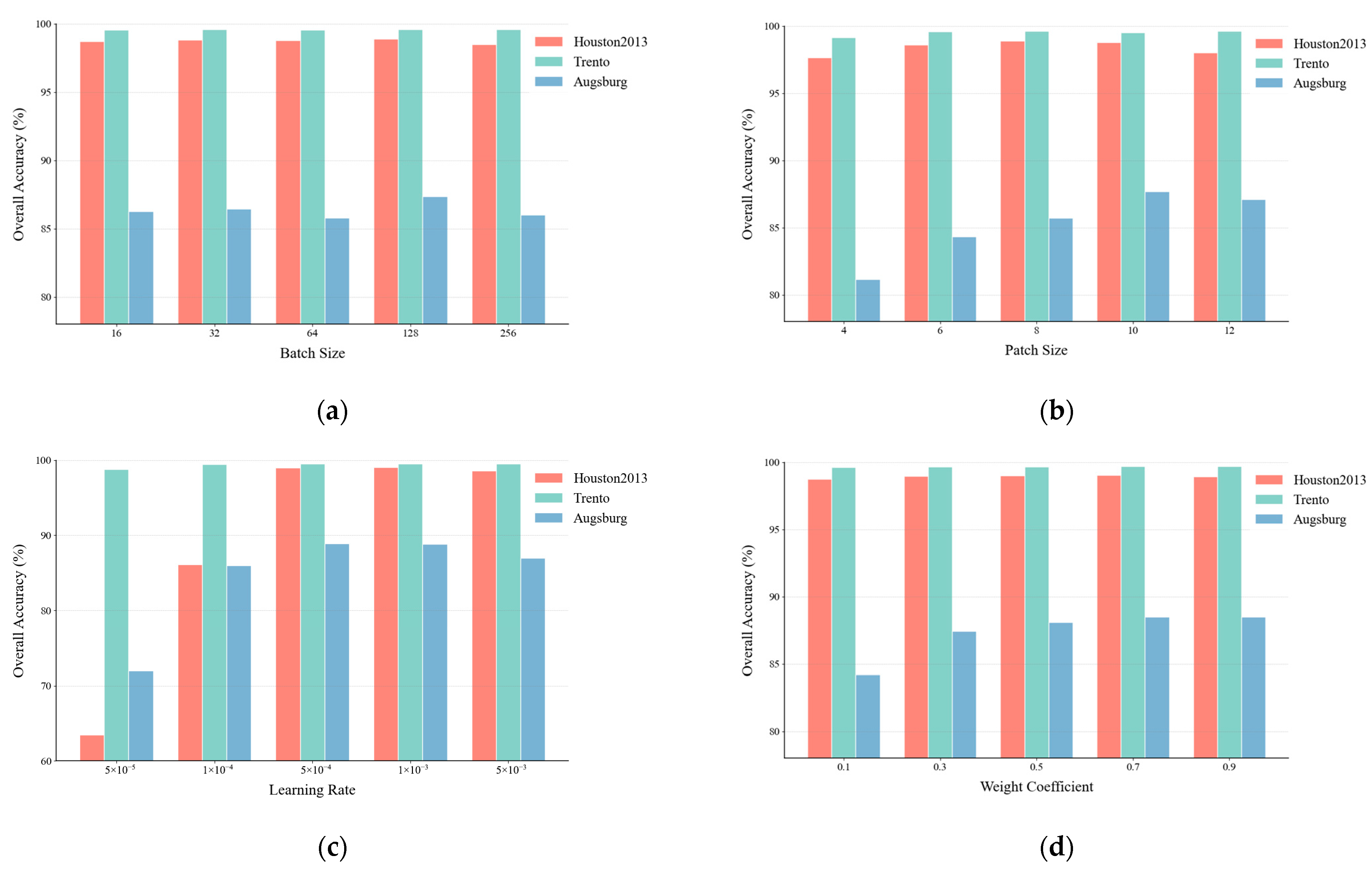 Figure 16. Influence of different parameters on the overall accuracy. (a) Batch size. (b) Patch size. (c) Learning rate. (d) Weight coefficient for feature fusion.
