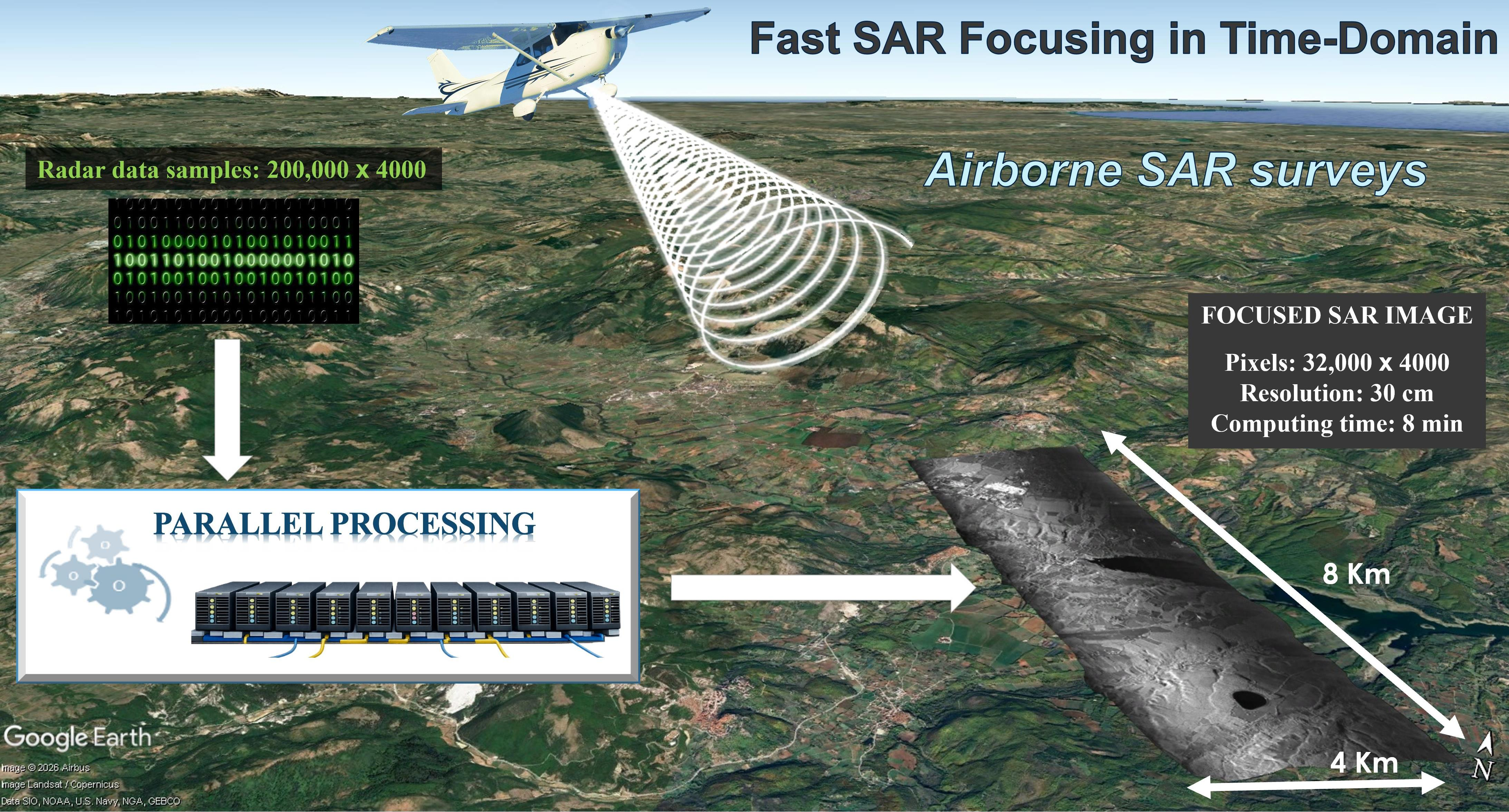 - For both proposed implementation strategies, TD focusing can be substantially accelerated through the proper application of parallel processing techniques. Depending on available hardware capabilities, significant speedup factors can be achieved. For instance, with the considered Information Technology (IT) platform, up to 177× have been achieved. Specifically, if we consider a SAR raw data size of 4000 × 200,000 samples, covering an area of approximately 3 km in slant range and 8 km in azimuth, and apply the pixel-wise approach to implement the TD focusing, by setting an azimuth resolution of 30 cm, over an output grid of 4000 × 32,000 pixels, with a single-job of the IT platform available at IREA-CNR we need 1560 min of computing time. Exploiting 256 jobs on the same platform, we reduce this computing time to just 8 min.