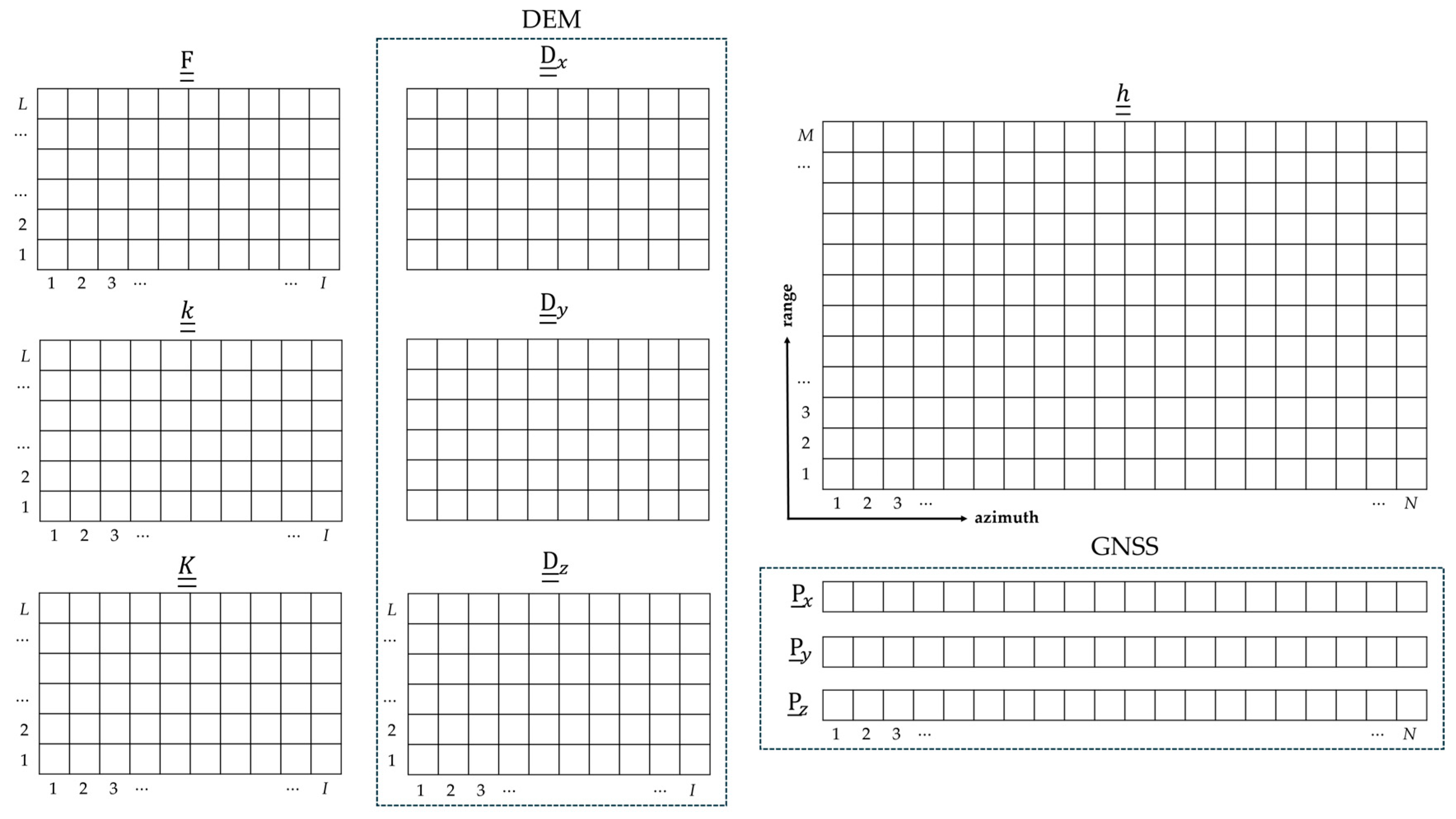 - An external Digital Elevation Model (DEM) that specifies, in a defined coordinate system, the ground position of each target of the considered output grid. Specifically, the DEM comprises three I × L matrices (, , , in Figure 1); in a geocentric Cartesian system (just to quote an example), these three matrices store the x, y, and z coordinates of the ground position of the targets.
