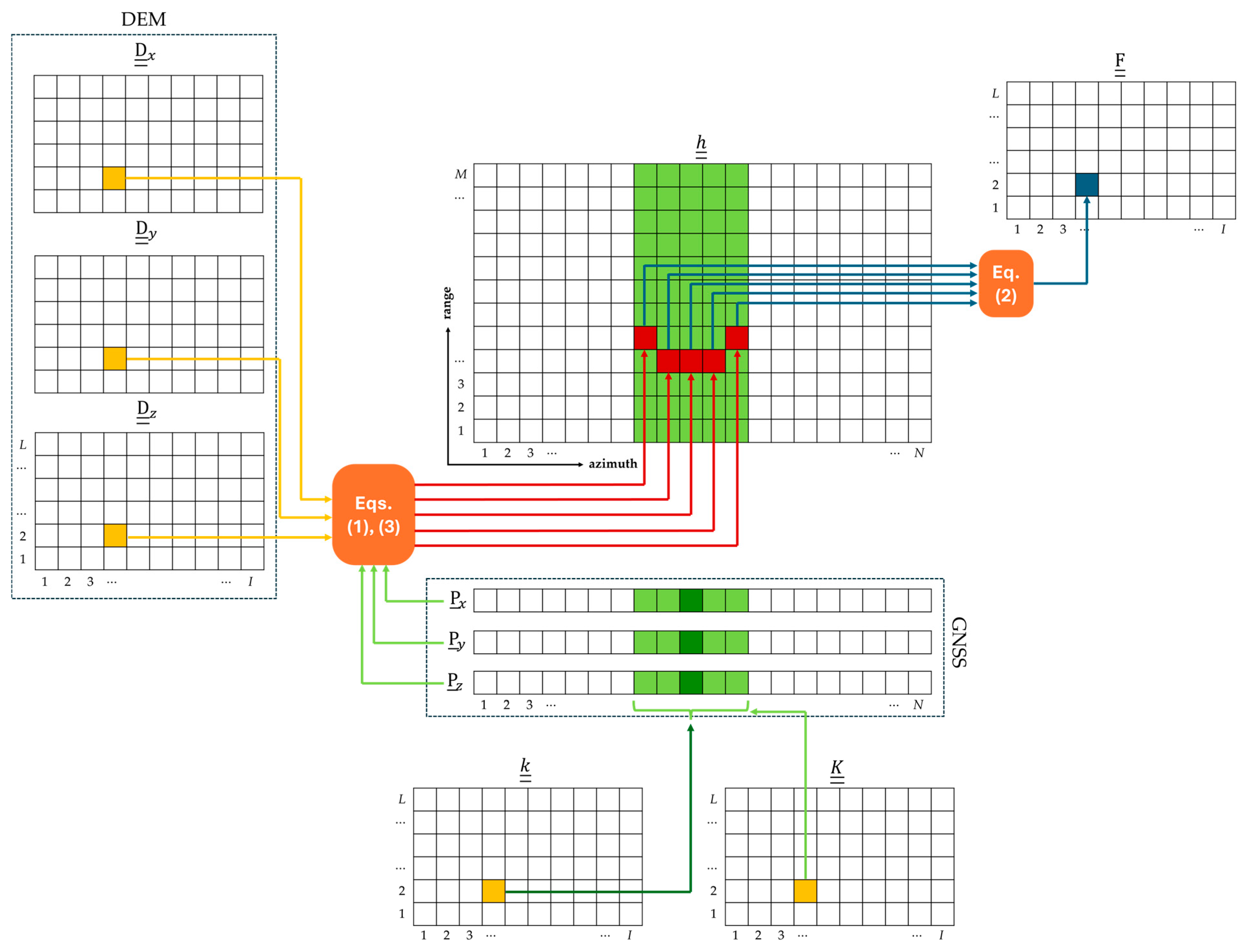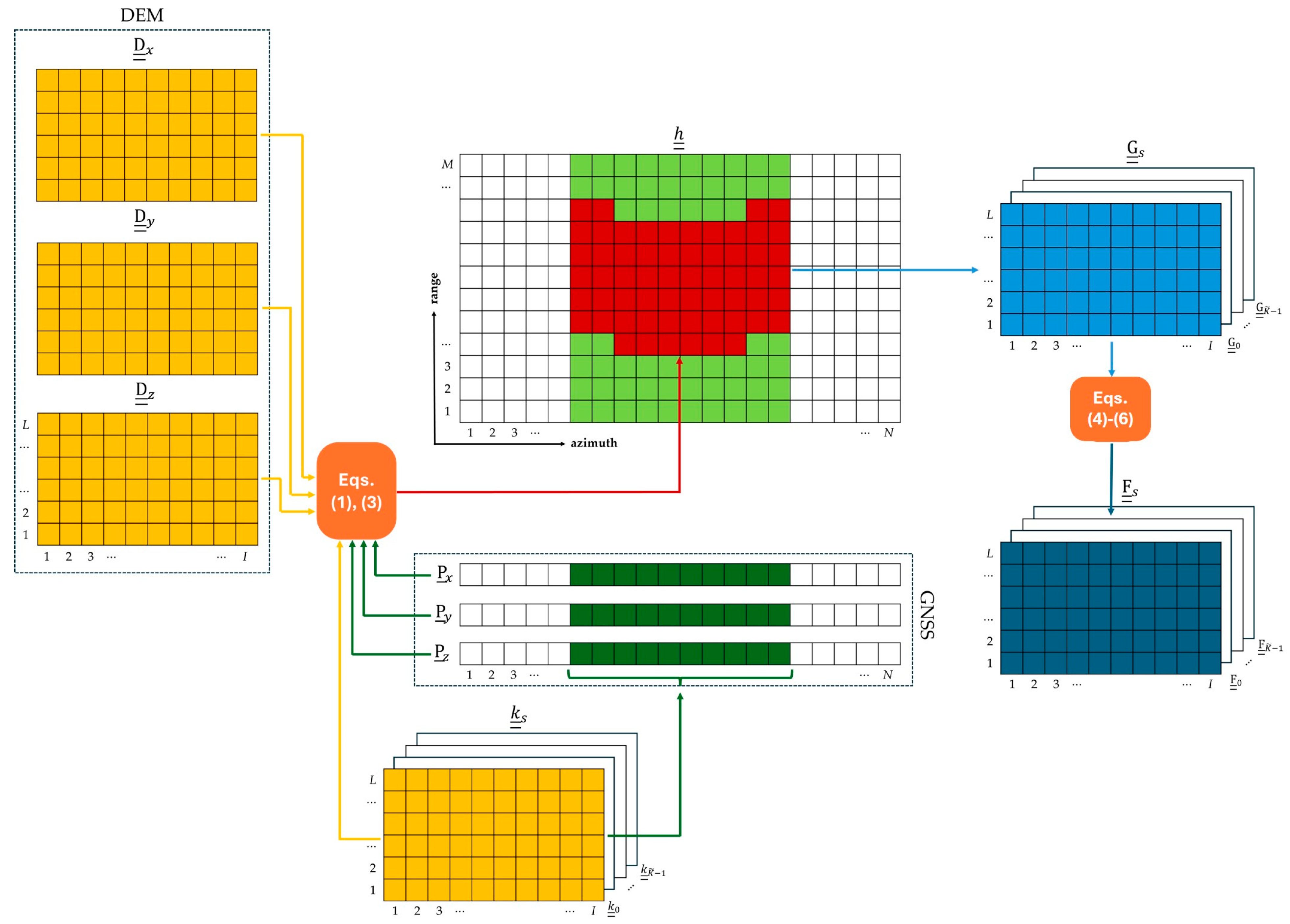 - the synthetic aperture center index, pointing to the dark green cell of the GNSS vectors in Figure 2;