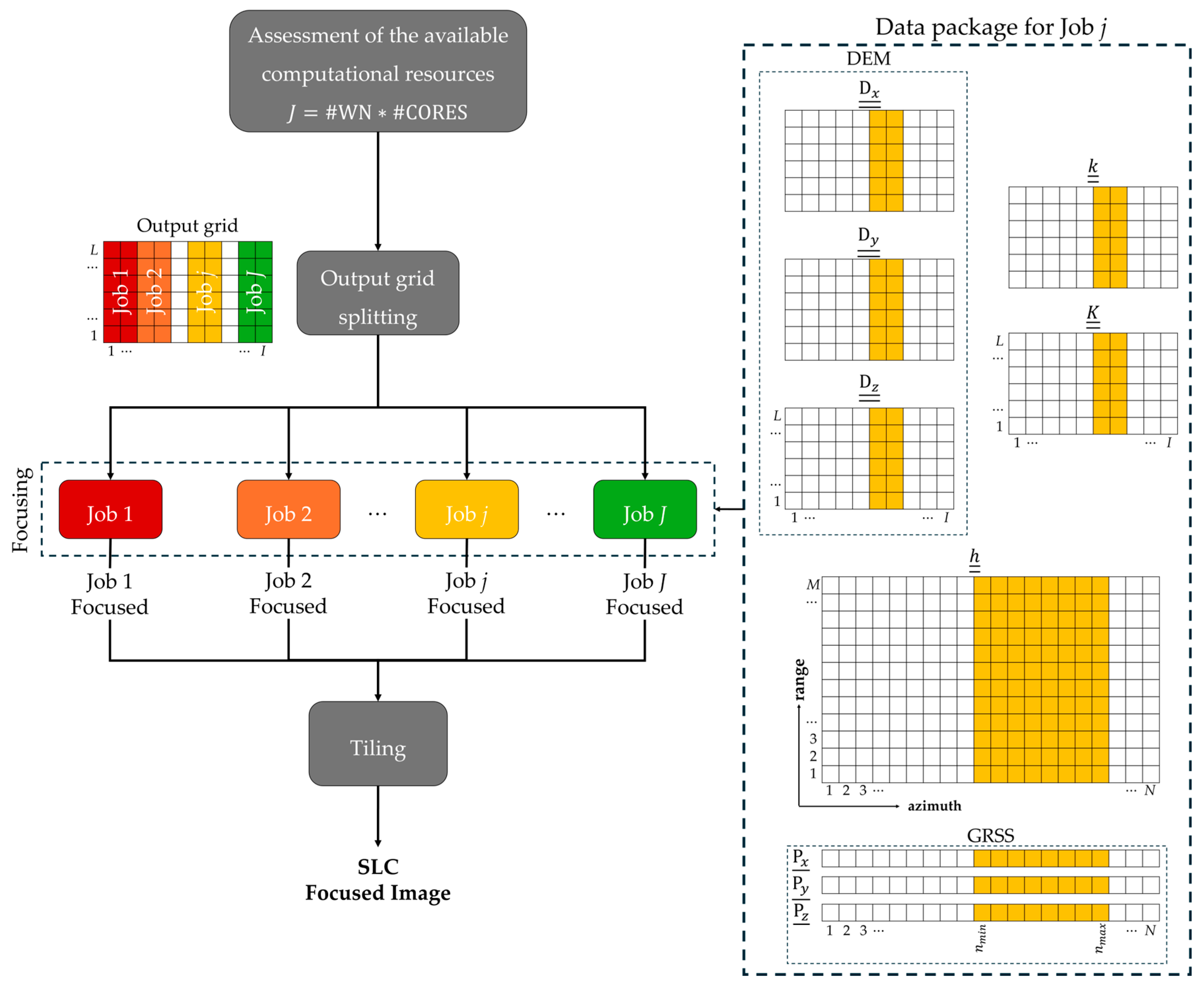 - Output Grid Splitting and Focusing. Based on the previous evaluation, the output grid is split into J adjacent, non-overlapping, equal-sized portions along the azimuth direction, while keeping the full range dimension intact. Each portion represents a task, which we refer to as a “job”, to be processed (i.e., focused) by using a single core on a designated WN. To prevent memory overload in the computing system, only the necessary data (referred to as “data package”) for performing the assigned job are allocated to each core.For each job, the data package includes the relevant portions of the external DEM, along with the corresponding segments of the matrices and , which are consistently partitioned with the output grid. Since these data matrices have the same dimensions as the output grid, each data portion has the same dimensions as well, making their partition straightforward once J is fixed.Selecting for each job the proper azimuth portions of the GNSS vectors and the range-focused SAR data matrix is, instead, not straightforward as well. Indeed, the GNSS vectors and the data matrix have all the same azimuth dimensions, which are, however, different from the azimuth dimension of the output grid. Therefore, this operation requires determining the minimum and maximum azimuth indexes ( and , respectively) of interest for the considered job. This is achieved by inspecting the indices contained in the portions of the matrices and relevant to the considered job. These indices indeed allow marking the track segment (i.e., the bounds of the GNSS vectors) that should be considered to focus each entire portion and, in turn, the azimuth boundaries of the matrix, which, similarly to the output grid, is not cut in the range dimension.