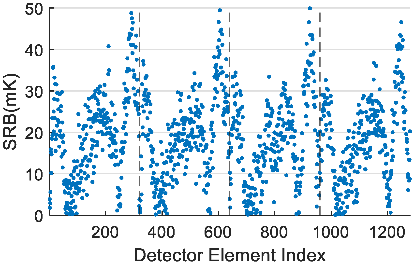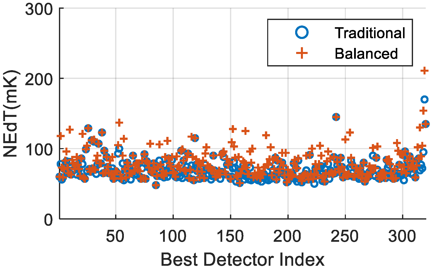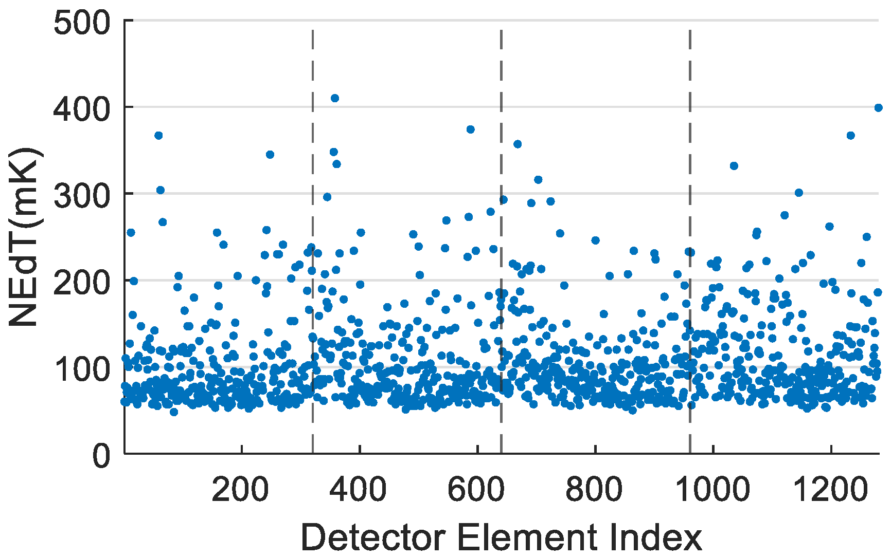 Blind detector identification is a crucial preprocessing step in best detector selection. Since the performance metrics of blind detectors often exhibit significant outliers—for example, some blind elements have responsivity close to zero, or their noise and NEdT values are several orders of magnitude higher than the overall mean—evaluating the overall performance of the detector array (such as average responsivity or average sensitivity) before blind element removal yields results that lack practical meaning and comparability. Traditional blind detector detection primarily relies on a few key parameters, including detector responsivity, noise level, and noise-equivalent differential temperature. A typical identification procedure is as follows: first, elements with responsivity lower than one-quarter of the mean responsivity of the entire array are removed; second, elements whose noise amplitude exceeds twice the mean noise of the entire array are excluded; finally, elements that do not meet the preset NEdT threshold are filtered out. Through such rule-based screening, most substandard elements that fail to meet detection requirements are effectively eliminated. After removing these extreme outliers, the overall performance of the detector array is usually significantly improved.
